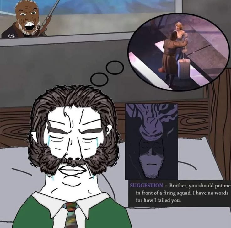 >>50118220 >Эдер - это максимально плоский персонаж с одним конфликтом внутри своей головы. Он плоский персонаж для ребенка у которого верх жизненных проблем это "не хочу учиться/работать" и "мама блин тупая((". В Эдере конфлик религиозной и национальной лояльности, конфликт между допустимостью сотворения зла во имя добра. Эдер объективно интереснее "мне мама придала и работать вождем заставляют((("
