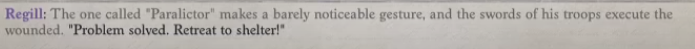 Ситуация в ПФ с Региллом такая, что раненные присутсвуют непосредственно в бою и никто их защищать в минус себе и общей обстановке не будет, как и оставлять их демонам. Плюс убийством раненных, они спасли живых и здоровых. Если ты говоришь что и из трупов могут делать гулей, то тогда убийством раненных на несколько гулей стало меньше, т.к. живые и здоровые убежали в безопасное место, а не подохли на месте битвы с гаргульями. Раненных все равно бы не смогли вытащить.