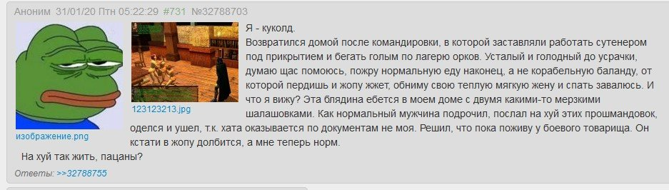 >>50117866 >>50117873 У вас так зашифровао что хуй поймешь про кого вы. А так, слышал я песенку группы Ногу Подвернул Ивана Стаховского, там была вставочка про обуление, полез гуглить - а там и видео и текст, где ясно и понятно кто кого и за что. Очень даже раненых добивают. При чём, уверен с обеих сторон. В этом и цель этой хуйни.