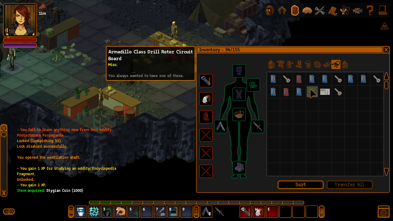 Пылесосим большой мир. Фаундри в этом плане конечно золотое место. Оддити экспы больше чем в Кор Сити + безопасно. Очень не хочется идти в поля, пока не накраблю хотя б 12 и не возьму Локус. Так-то конечно хочется еще и таби, и очки с детектом, и нормальный пси банд(дамага как-то мало), и крафтовый щит. Надо бы начинать квест на Окулуc. Потому что все вышеназванное требует Константина. Еще вот думаю в кому из олигархов податься. ЖКХ дает полезную броню и чуть больше оддити. Кортех лишнего вендора электроники(опять же нужно ли при наличии Константина). Из Дронов vs Протыкторат пожалуй выберу Дронов. Там не придется бегать среди мутагенных облаков между агрессивных нпс.