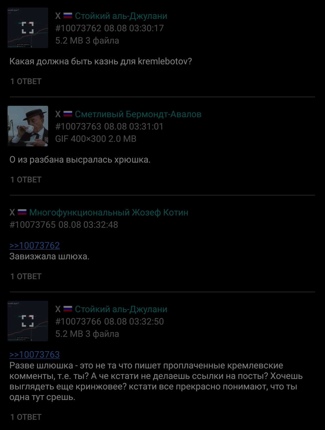 Ты опять там обнулилась? За базар свой поясни и будет тебе разговор, а пока пшел отсюда, попуск.