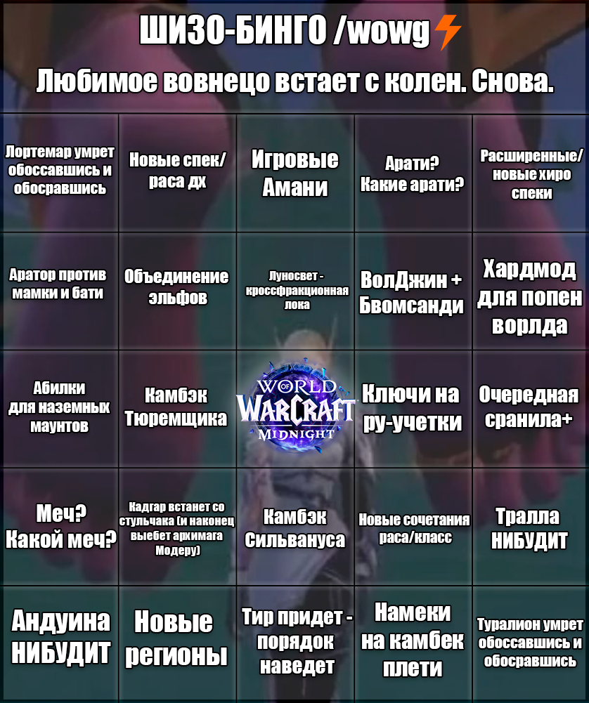 >>50125919 Туралик становится официальным постоянным лидером Альянса, а не временным. Лортемар, жидко пукнув, помер. Азшара вернется в суйжет. Новые расы под фракции. Новые спеки. Новые комбинации классов и рас. Дома и интерьер за монеты, как и трансмоги. В синематике покажут ножки Ксалатат. Луносвет поделят на фракции. Утер появится в суйжете вновь. Тир вернется в суйжет. Про Империю Арати благополучно забудут. Калемщик не будет участвовать в суйжете как полноценный персонаж. Обновлят какие-то еще локации, кроме Луносвета и окрестностей. Новых регионов не будет.