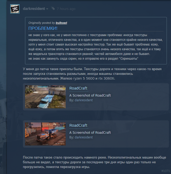 Кто-нибудь сталкивался с мыльными текстурами в игре? Игра идёт нормально, но спустя 20-40 минут текстуры начинают мылиться и доходят буквально до состояния пикрилов, будто в 2005 попадаешь. Думал патч спасёт, но нет. До патча вообще пиздец был на подобие 3 пикрила. 8 полигонов на весь трактар. 8гб видео имею, 32 озу есть, хуй знает чё игре надо. Нигде подобного никогда не было.