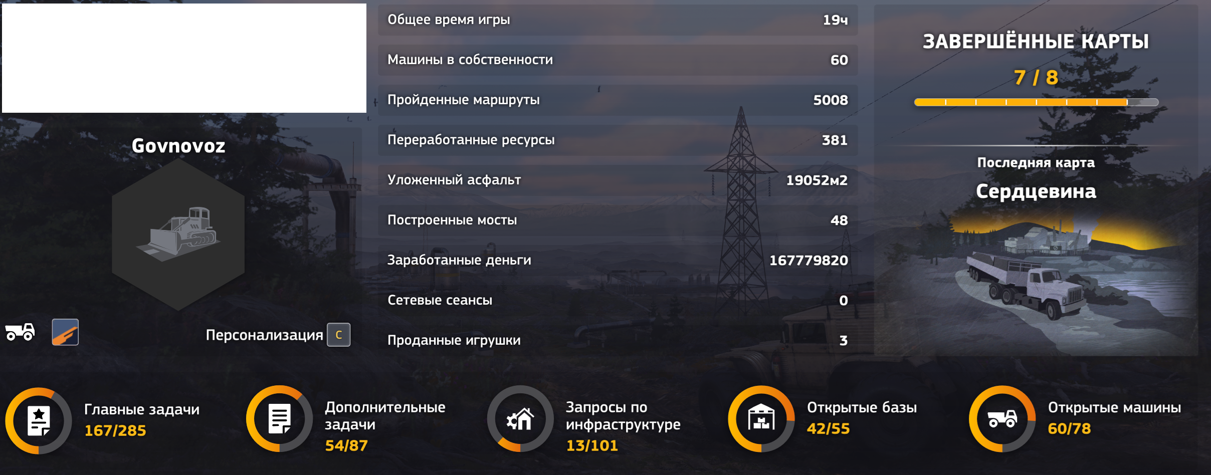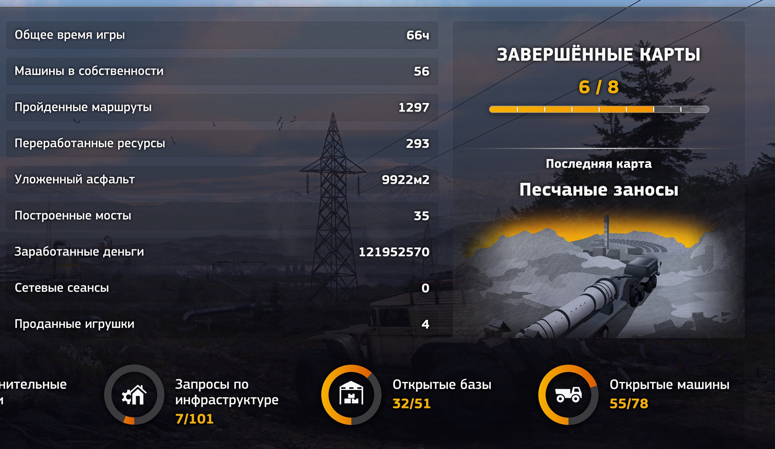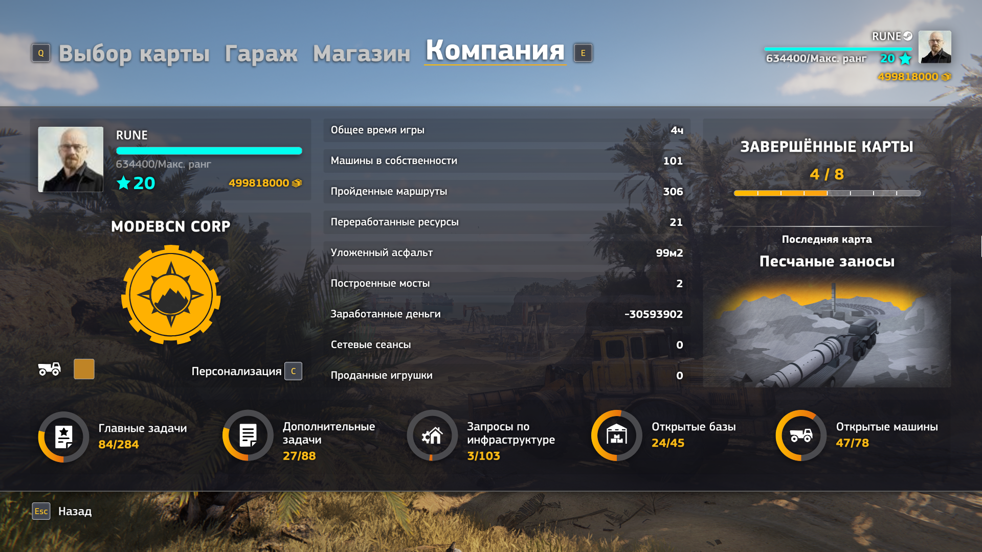 Вот как пример к слову вчера чел рассказывал что 4 карты закрыл на фулл за 13 часов, у меня на одном дополнитлльном микрозадании просто с нихуя застрял вентиль в текстуре трубы и чтобы его снять я ебался минут 40 а перед этим порт чистил от говняка разбросанного проводил электричество, делал дорогу и привёз трубы, а это было всё засчитано как 1 задание, а их больше 40 на каждой карте, это я к тому что как уже говорил чтобы полностью всё навернуть нужно часов 200 и ещё если не налоегать на прокладку автобанов и переработкой ресурсов, так будет все 400