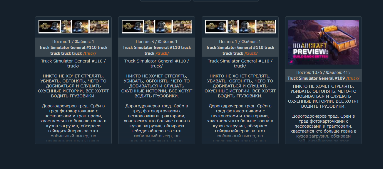 Дорогодрочеров тред. Срём в тред фотокарточками с песковозами и тракторами, хвастаемся кто больше говна в кузов загрузил, обсираем геймдизайнеров за этот мобильный высер, но продолжаем жрать говно.