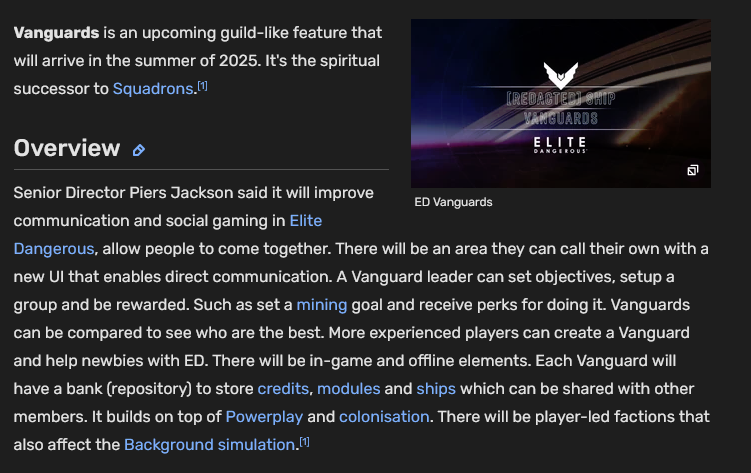 Мелкая хуйня для социоблядей крч. Что-то типа гильдии в ммо - гильдчат, гильдбанк, база... https://www.elitedangerous.com/update-notes/4-2-0-0 ну и свой кар теперь всегда на панельке навигации отображается, несмотря на фильтры. Стоило полугода разработки.
