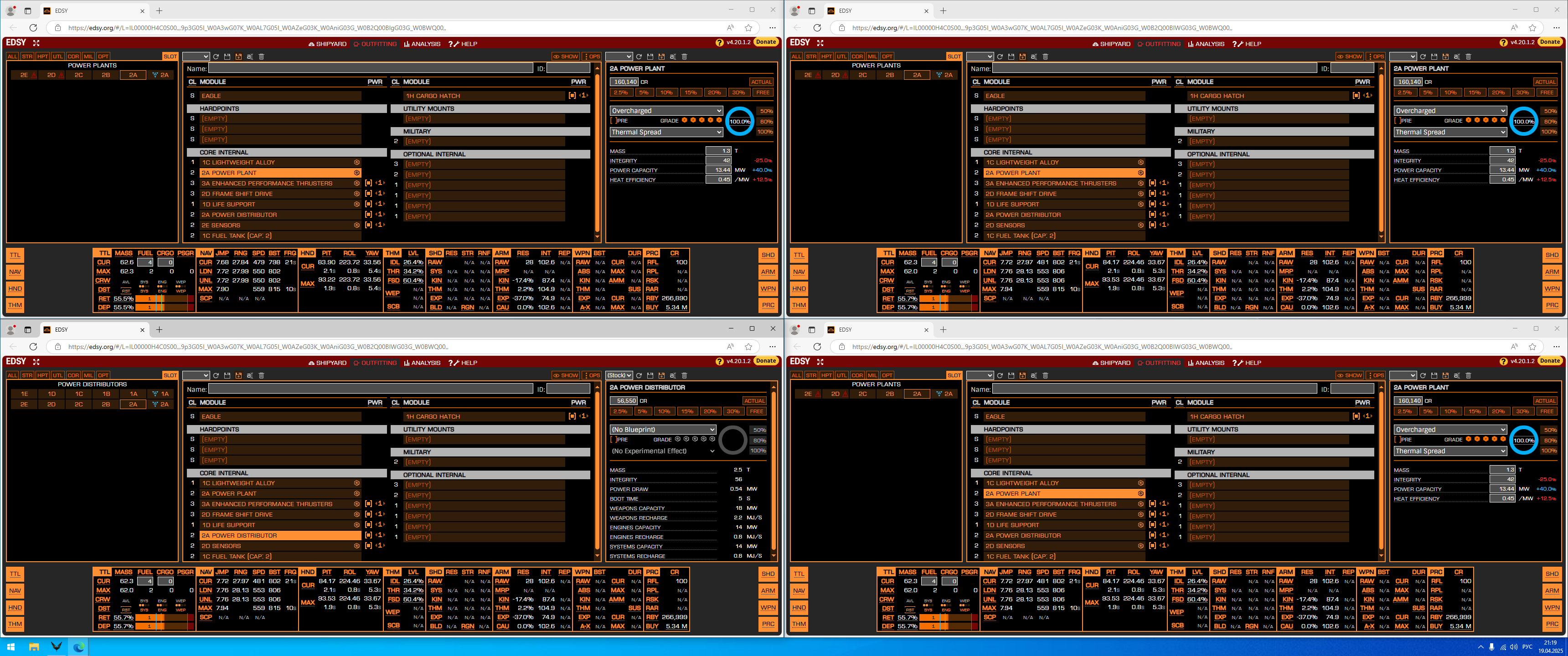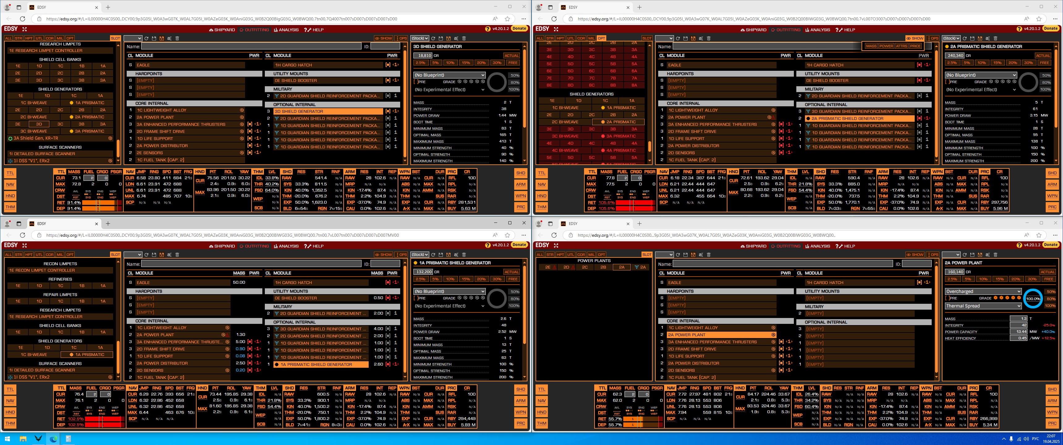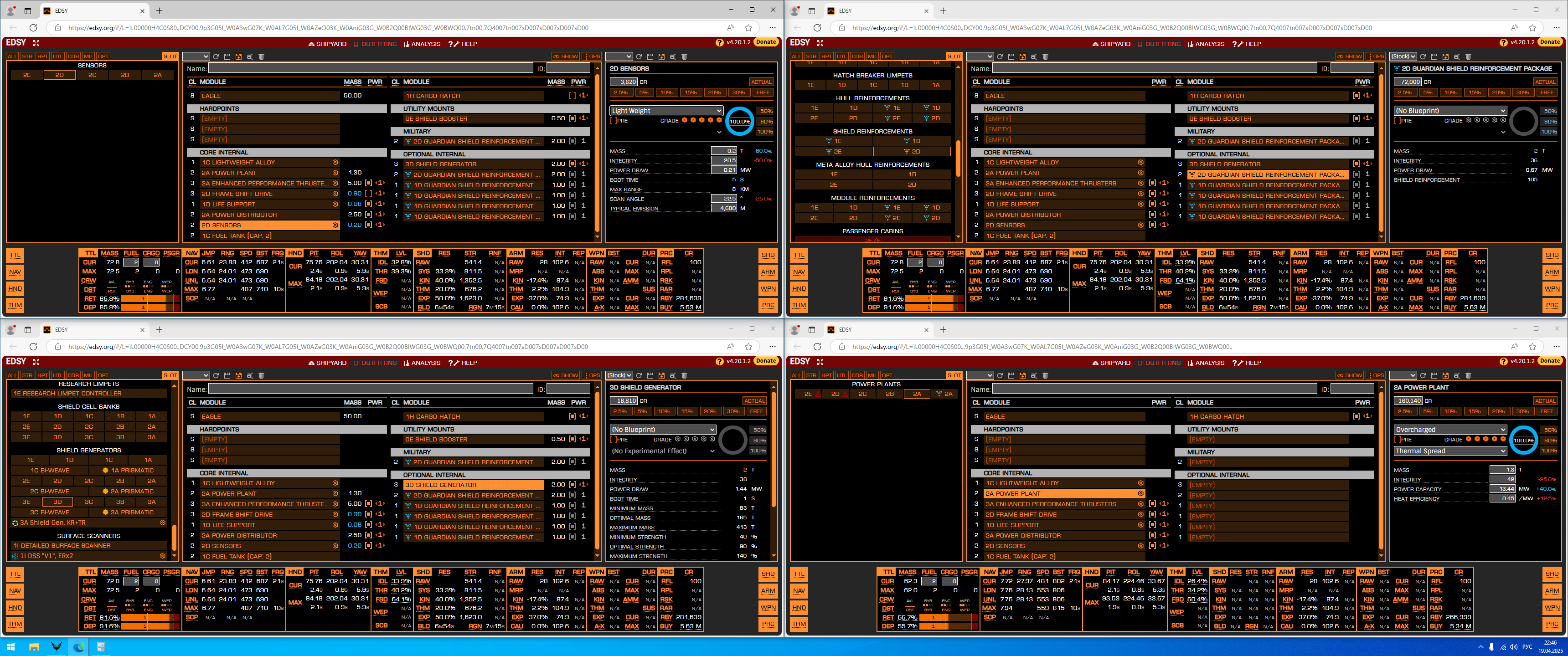 https://edsy.org/s/v8dHswY - а это моя кобра, но она ещё не оптимизирована. Прикол в чем, я во время сборки корабля, создаю несколько экземпляров, и смотрю, какой из них наиболее "усрёдненный", по отношению к другим сборкам. У меня сейчас на ней стоят 5D усиленные щиты, НО, я могу поменять их на: 4D усиленные щиты, и потерять всего 20 ед. щита, но получить в скорости и прыжке 4А усиленные щиты, потерять ВЕЗДЕ, но выиграть аж лишние 100 щита И ещё куча других параметров, возможностей, которые открывает каждая возможная конфигурация.