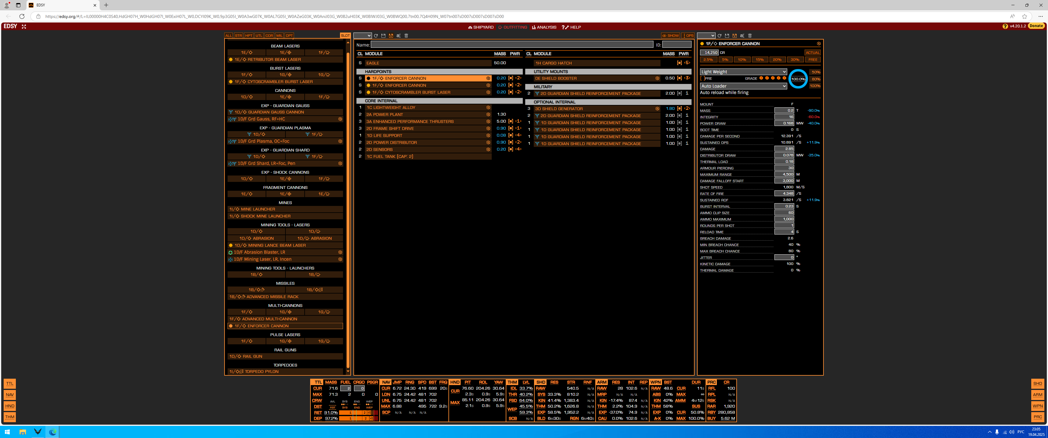 https://edsy.org/s/vkWe5La - Игл. Совершенно ёбнутый в плане щитов корабль. Ему выгоднее ставить щиты меньшего класса, а объем догонять SRP гардиановскими. Причем кек в том, что и бивейв, и призма, и обычные щиты А/D классов имеют и свои плюсы и минусы, лол. С чертежом такая же ситуация. Я до сих пор не могу нащупать тот самый оптимальный по всем фронтам вариант. Да, кстати, чертежи на оружие тоже можно взять другие, поменяв скорость на огневую мощь.