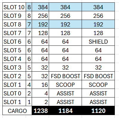 Итог (Edsy почему-то даёт расхождение по массе с пустым билдом, поэтому подсчёт идёт просто сложением, массы всех модулей) 3 размер: D - 541.4 щита. Общий "щитовой" тоннаж - 10.5 тонн или ~51.7 щита на тонну // Скорость - 684 A - 560.1 щита. Общий "щитовой" тоннаж - 13.5 тонн или ~41.5 щита на тонну // Скорость - 658 Bi - 541.4 щита. Общий "щитовой" тоннаж - 13.5 тонн или ~40.1 щита на тонну // Скорость - 658 Prism - 578.8 щита. Общий "Щитовой" тоннаж 18.5 тонн или ~31.3 щита на тонну // Скорость - 620 2 размер: D - 553.0 щита. Общий "Щитовой" тоннаж 11.5 тонн или ~48.1 щита на тонну // Скорость - 678 A - 571.7 щита. Общий "Щитовой" тоннаж 13 тонн или 43.9~ щита на тонну // Скорость - 665 Bi - 553.0 щита. Общий "Щитовой" тоннаж 13 тонн или ~42.5 щита на тонну // Скорость - 665 Prism - 590.4 щита. Общий "Щитовой" тоннаж 15.5 тонн или ~38.1 щита на тонну // Скорость - 644 1 размер: D - 563.0 щита. Общий "Щитовой" тоннаж 12 тонн или ~46.9 щита на тонну // Скорость - 674 A - 581.8 щита. Общий "Щитовой" тоннаж 12.8 тонн или ~45.5 щита на тонну // Скорость - 667 Bi -563.0 щита. Общий "Щитовой" тоннаж 12.8 тонн или ~43.9 щита на тонну // Скорость - 667 Prism - 600.5 щита. Общий "Щитовой" тоннаж 14.1 тонн или ~42.6 щита на тонну // Скорость - 656
