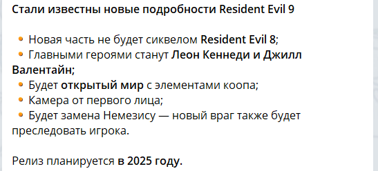 Что касается Resident Evil 9, то Dusk Golem решил опровергнуть свои же слова об анонсе игры этим летом. Он извинился за «метания из стороны в сторону» и заявил, что девятую часть представят позднее, а выйдет она в конце 2025 года или уже в 2026 году. Согласно слухам, события в ней развернутся на острове в Юго-Восточной Азии.