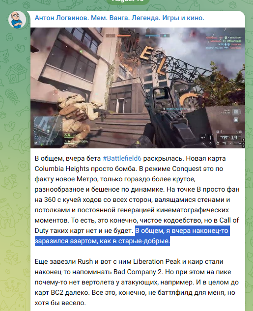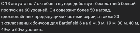Здравсвтуйте ребята! Хочу вам сказать что мне очень нравится игра Battlefield 6, и я всем советую её купить. Мне очень интересно в неё играть, сразу видно возвращение серии к истокам. В игре классная стрельба и чувство настоящего поля боя. Приобрести предзаказ можно в Steam или EAPLAY. Рекомендую купить Phantom Edition, так как с ним вы получите максимально приятные эмоции. [/end]