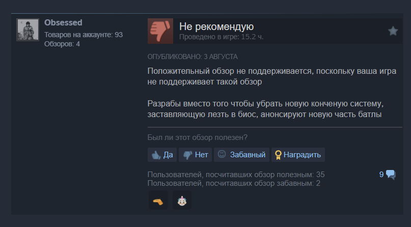 «Игра не плохая, но в таком виде я не хочу продолжать играть», — пишет BookkeeperPercival.