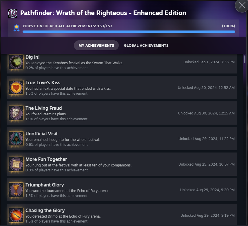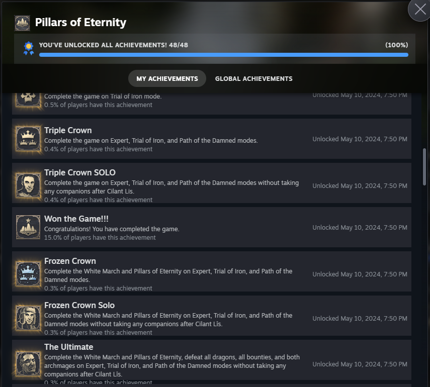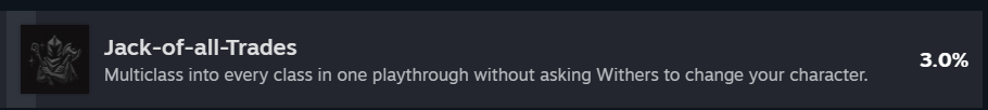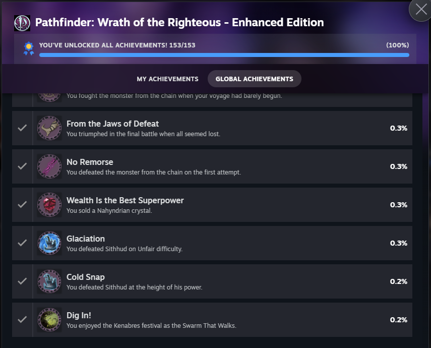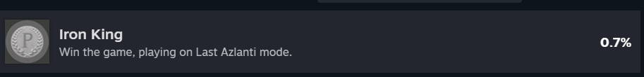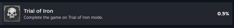 Если в какой то игре, которая давно вышла и супер редкие ачивки имеют ниже 1% это говорит лишь о том что игра не особо популярна, а не её уровень сложности. Потому что все эти ачивки люди читерят, причем у меня нет сомнений что около 80% кому не похуй на эти ачивки (спозерить или поставить себе на витрину) именно читерят, доказать я это увы не смогу, потому что для этого нет инструментов, но вот например айзек - один из самых популярных рогаликов, где очень много ачивок и чтоб заработать пик нужно МИНИМУМ за игрой 400 часов просидеть, причем потея, а по хорошему ~600 с момента запуска игры в первый раз, очевидно 4% от всех купивших игру это пиздец какая большая цифра и легитимных тут дай бог пол процента.
