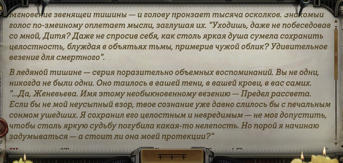 >>50160180 Ну честно скажу, что мне рт больше, чем пф понравился намного. Вотр меня хватило на одно прохождение, и то даже не до конца. Подзадушило, и дело не в сложности, а в большом количестве фитов, которые на тебя выкидывают, и чтоб собрать что-то рабочее, нужно уж очень много времени потратить. В роге в этом плане почеловечнее, прокачка меньше времени занимает намного. Да и по сеттингу больше зашел рт, я с него в ваху и вкатился, можно сказать. Особенно доставило, как я по привычке хотел добряка отыгрывать, но после того, как с Райкады демоны полезли, а эльдары Янус под себя подмяли, ушел в догму и больше не пытался схизматиком там быть. Хотя отзывов о пф в плане вариативности отыгрыша куча, что меня и привлекло. Можете даже говном закидать, но мне пилларсы и тирания больше зашли, чем пф. Больше зацепил и лор, и сюжет. Но я не считаю пф калом. Просто не моя игра.