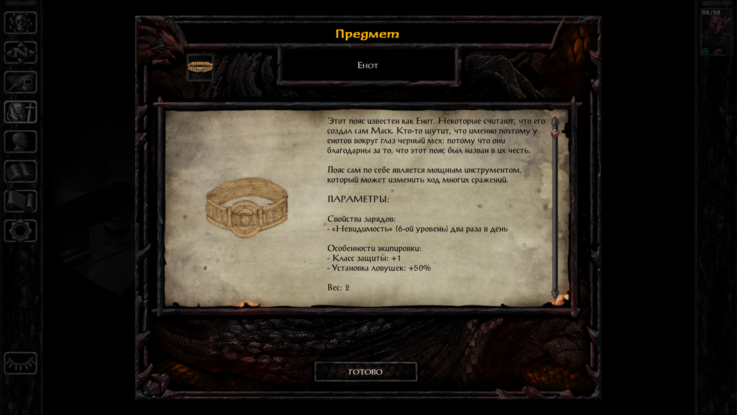 Впервые собрал пояс енота из бляхи и ремня, который даёт аж два заряда невидимости в день. Имба для первого бг, канеш, но всё же его собирать из двух неизвестных частей нужно, так что мне тут просто повезло. Купил свиток защиты от магии и пару амулетов, и без проблем прошёлся в инвизе по шахтам до Даваерона.