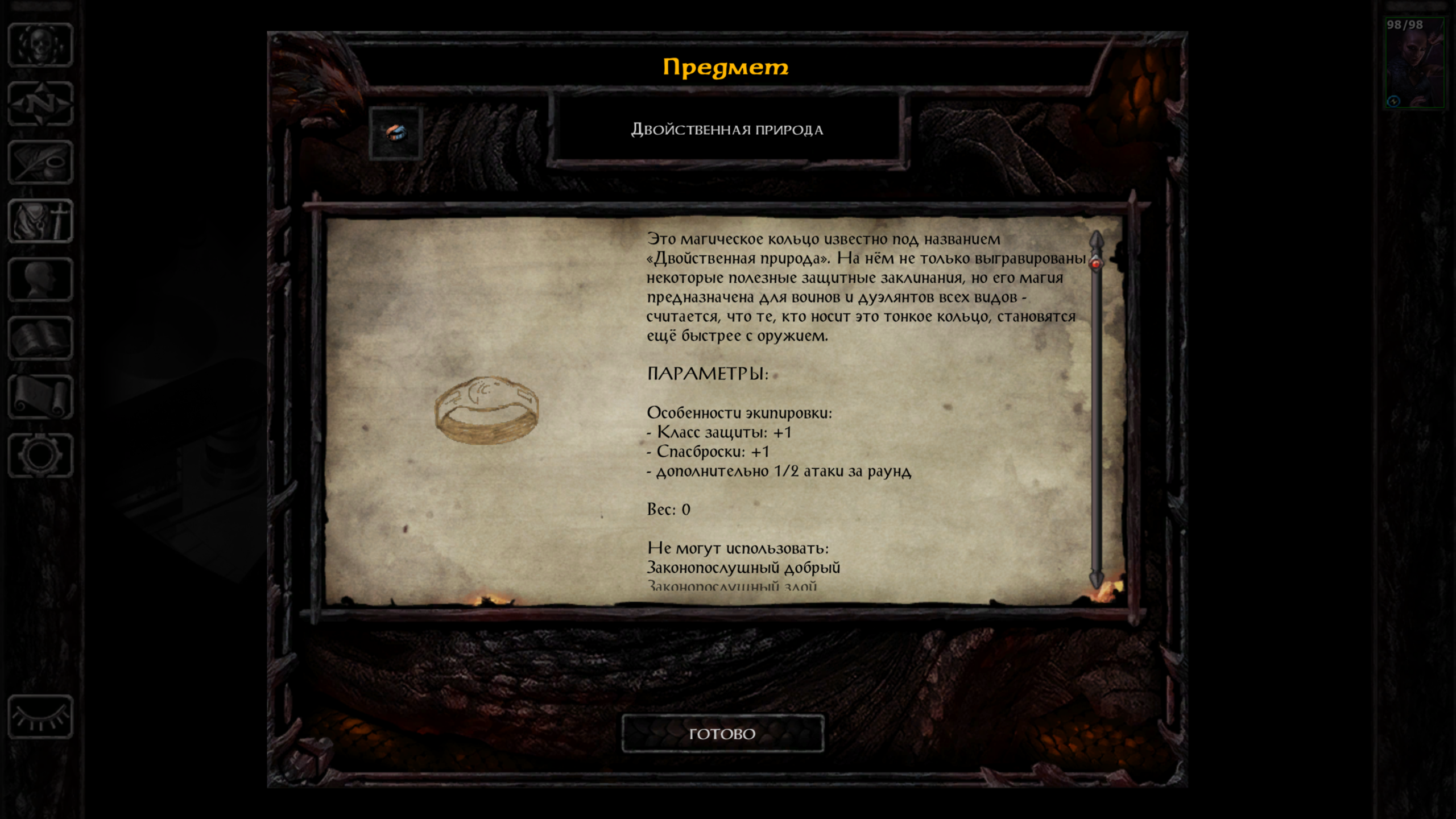 В игре по какой-то причине совсем не могу найти никаких хороших ножей. Даже волшебного +1 ножа не могу найти (скс половину магических +1 вещей поменял на немагические +1), но по старой памяти я запомнил, что в новой локации в школе улькастера есть пещера с пауками и боссом-пауком. Закупился во вратах зельями и свитком защиты от яда, одолел босса-паука и нашёл в его логове очень приличный ножичек. Впервые решил зачистить остальную пещеру с пауками, пока на мне ещё висели баффы, и к своему удивлению нашёл ещё и вот такое колечко, которое стакается с дефолтным на +1 защиты и спасброскам.