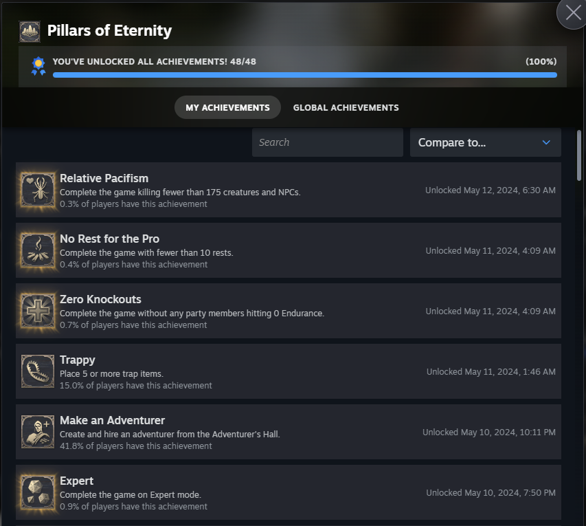 >3.9% >400-600 часов на получение Ожидаемый процент. Это же бесконечная дрочильня, а не ежегодный кАААААл в котором ачивку за первый запуск/уровень/туториал имеют только 50%, потому что про эту херню забудут на несколько лет сразу после покупки.