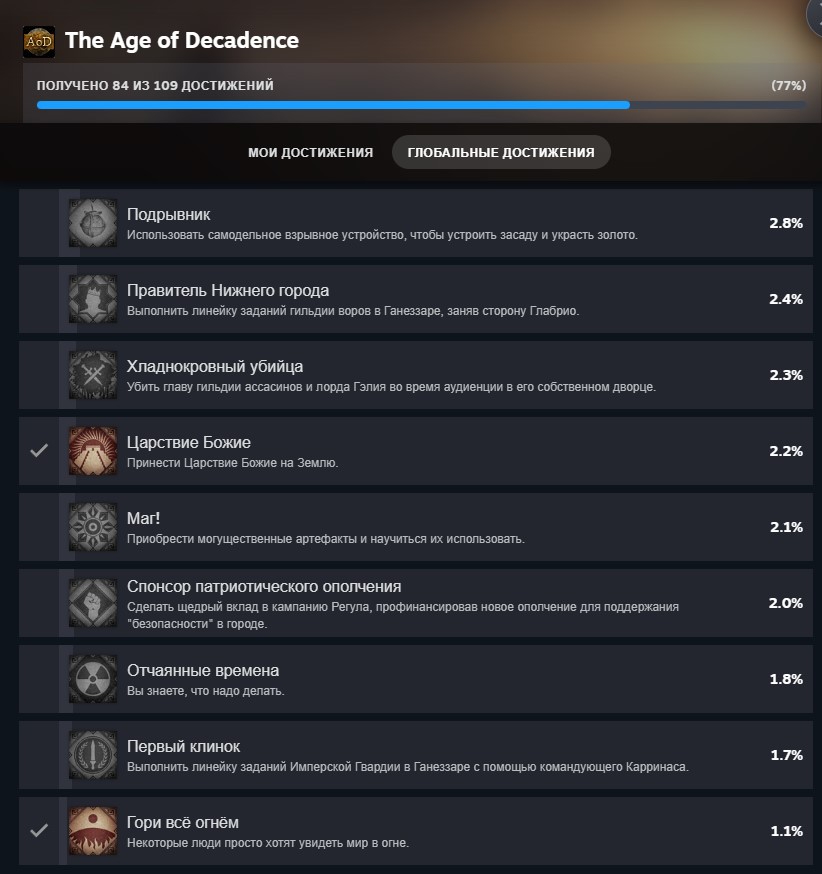 Спор не читал. Вот мои достижения в AoD. Как прошёл так и прошёл, нафиг мне что-то выбивать. В этом же и смысл, не?
