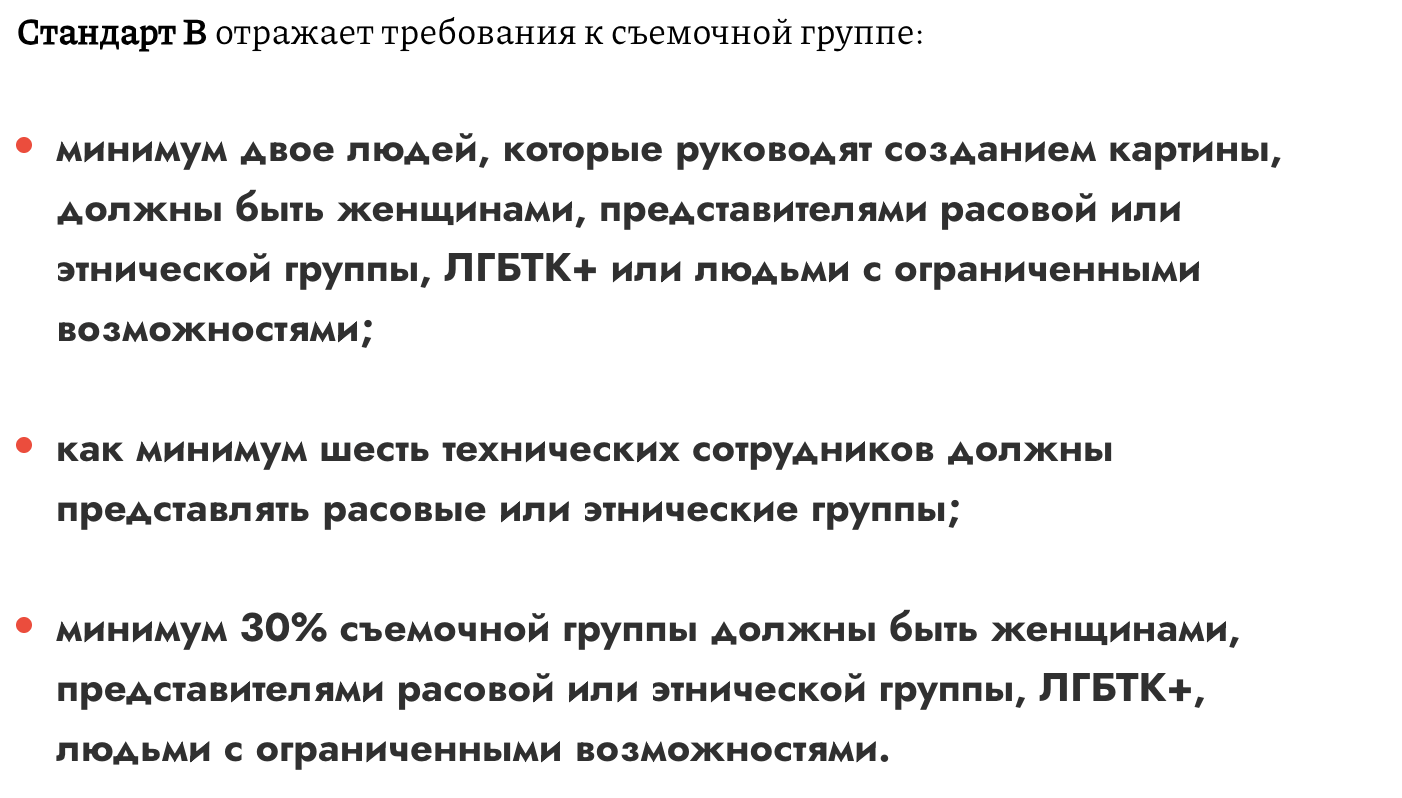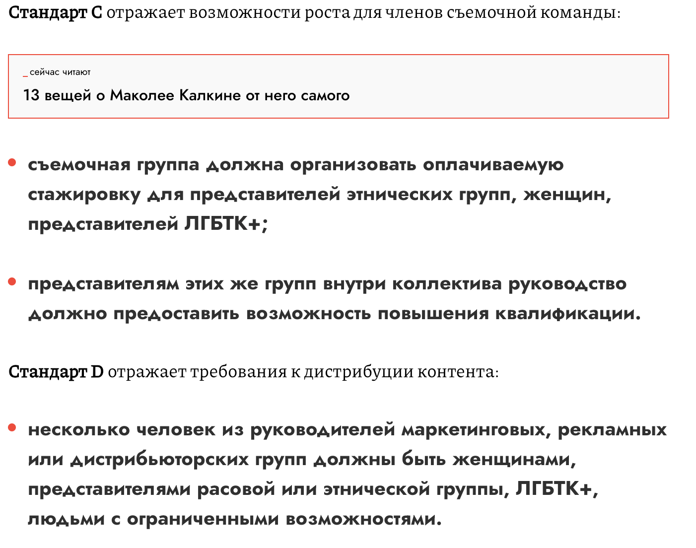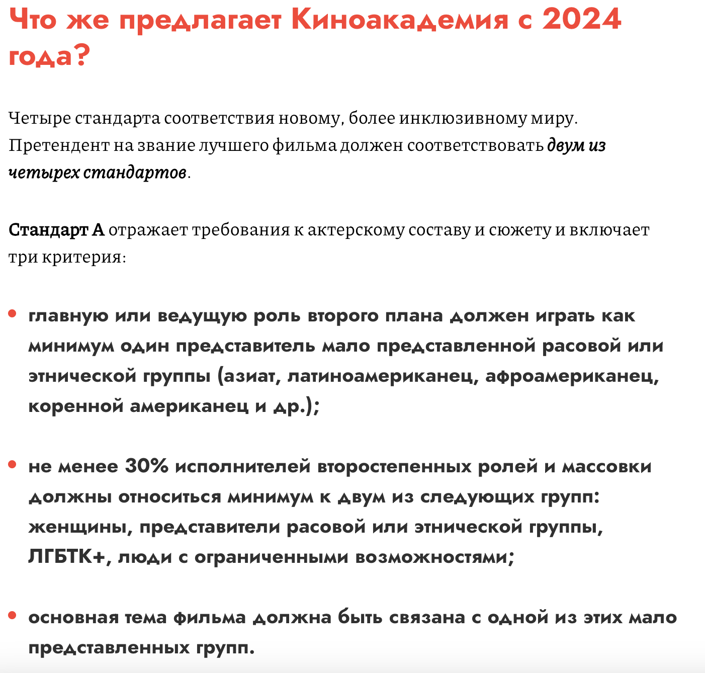 >>50157526 Лично у меня повестка как правило ломает погружение, потому что в нынешних проектах на неё делают упор, именно чтобы выделить дайвёрсити, потому что многие награды от этого зависят. На примере фильмов - вот тебе список обновлённых критериев 2024 года, которым должен соответствовать фильм, чтобы претендовать на главную награду на Оскаре, чекни скрины. А ещё они сильно перекроили состав комиссии, официально утвердив квоты. Т.е. за остальные номинации тоже голосует теперь куча меньшинств - сам понимаешь, что они будут выбирать. В игровых трендах похожая история начинает прослеживаться.