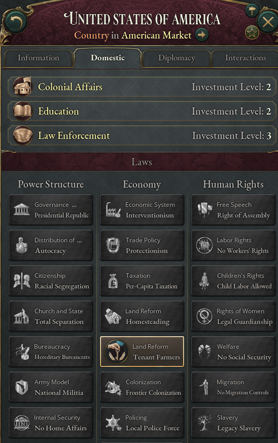 >>50170795 В этот раз поиграю без совка, а с протекционизмом и интервенционизмом. Всем рекомендую захватывать Нью-Йорк, Статуя Свободы дает ебнутый бонус на миграцию. Я еще думал насчет захвата Мичигана ради Форд Моторс, но это слишком геморно оказалось.