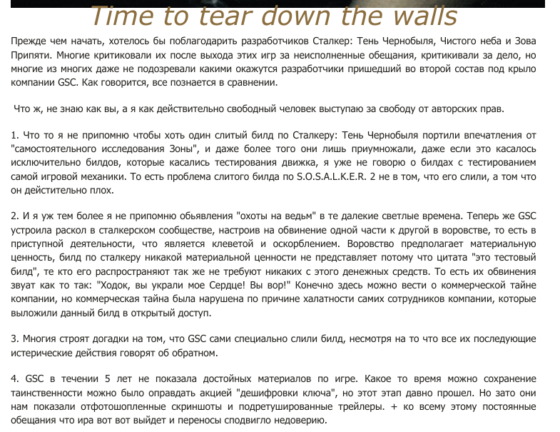 Нах нужен сталкер 2 когда существует фоллаут который даже после 10 лет во всём лучше? А сталкер тч был крут лишь потому что фоллаут 3 вышел в 2008. Сталкер в который можно играть это сборки на кок, без них это просто сельское дерьмо для непритязательных скуфов и пятаков