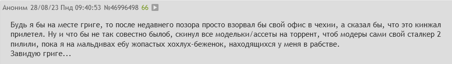 >>50166435 тычьё - кривая косая хуйня, собранная из говна и палок, жидко пукнувшего, обосравшегося и обоссавшегося, тупа здохнувшего обливион лоста на сыром и недоделанном алайфе от сытянова и ясенева, с уклоном в филлеры и пострелушки уровня ретюрн ту кастл вульфенштайн чийен - всратая технодемка на перекрученном движке от тычьё, с сырым движковым кодом поверх старого белдовского, с плохо настроенными материалами, с тонной багов и глюков, но пригодного для съёмок скам-роликов про красивую погоду и спецэффекты для прогрева немецкого издателя и гоймеров на шекельштейны зипьё - кривая косая хуета на двежке чийен, с костылями и ухищренниями, чтобы сымитировать качественную игру (успешно), с кучей сюжетных арок на вырост для релиза невышедшего сталкер два образца 2009-2011 гг., абсолютно непригодная для моддинга по причине узкой направленности под техническое задание для разработчиков, исключающего всякие попытки переделки под крупные задачи иных проектов сычье - имитация наличия компьютерной игры для грабежа и отмывания серого и чёрного нала американских убийц и уголовников из микрософт