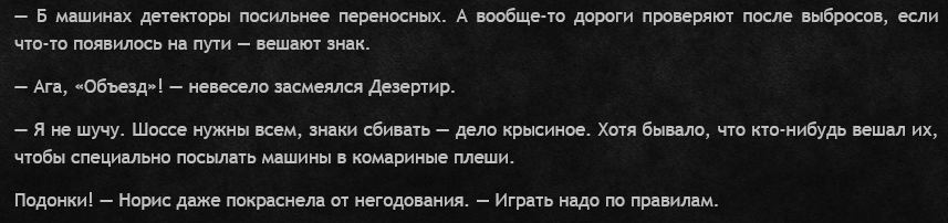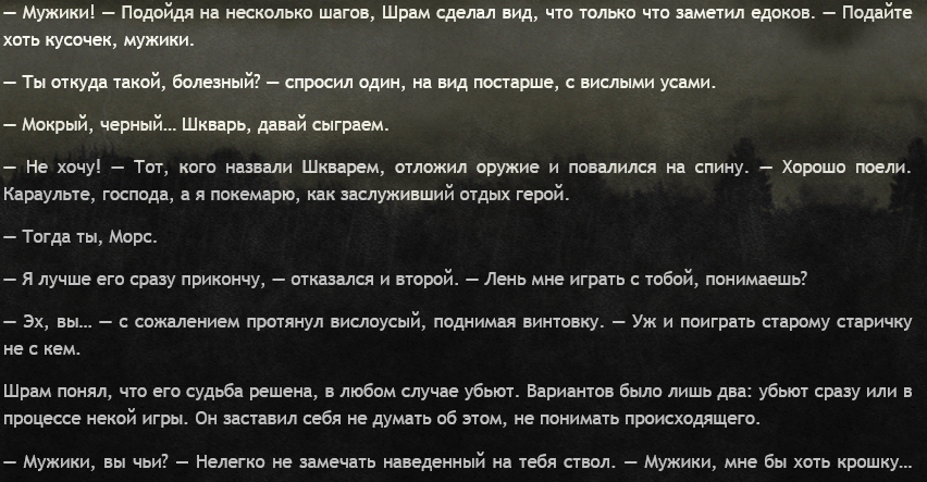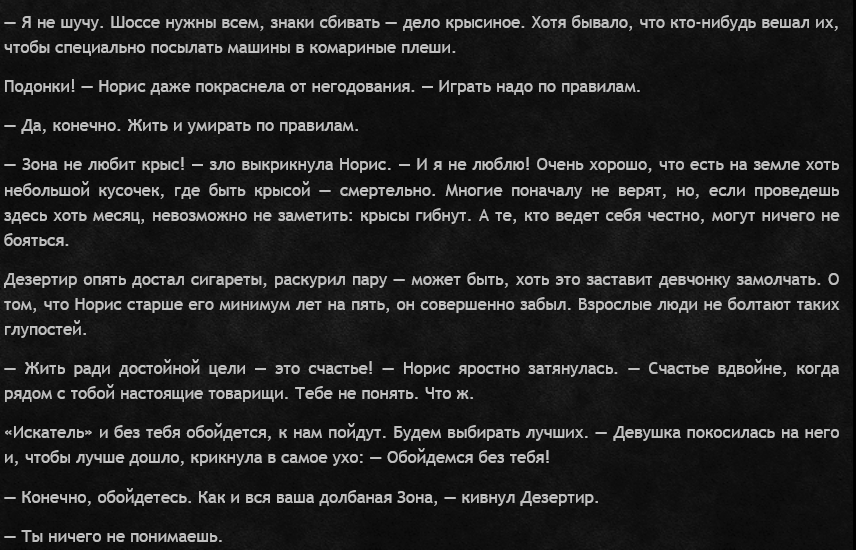 «А если разобраться, что такое для сталкера пять часов? Плюнуть и растереть. А двенадцать часов не хочешь? А двое суток не хочешь? Когда за ночь не успел, целый день в Зоне лежишь рылом в землю и уже не молишься даже, а вроде бы бредишь, и сам не знаешь, живой ты или мертвый…»
