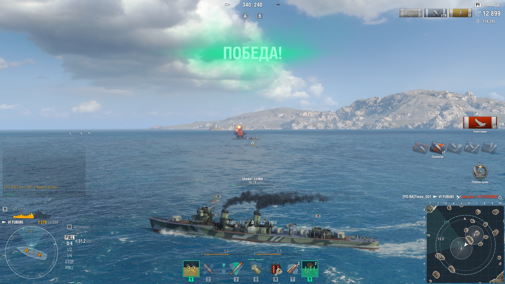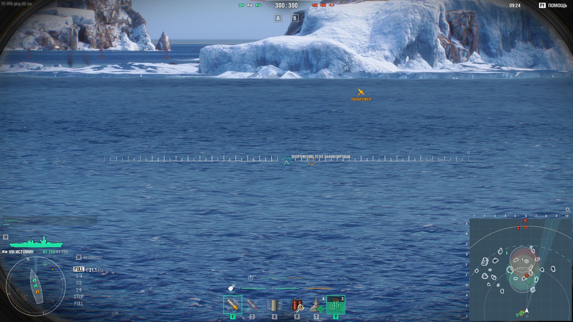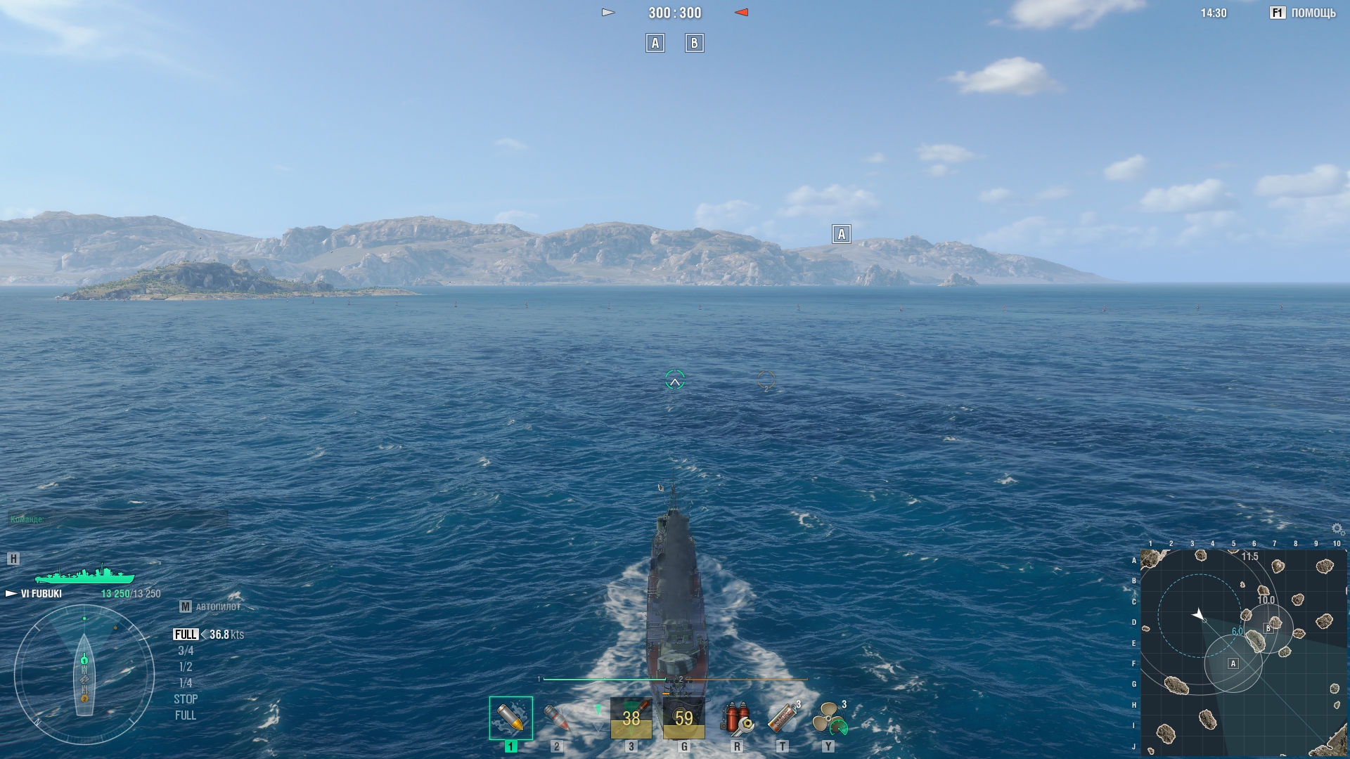 Блин, чёт эсминцы совсем калечные — дальность хода торпед сопоставима с дистанцией засвета, лол. И как тогда кидать из инвиза? У меня только один раз получилось подловить линкор, идущий меж островами.