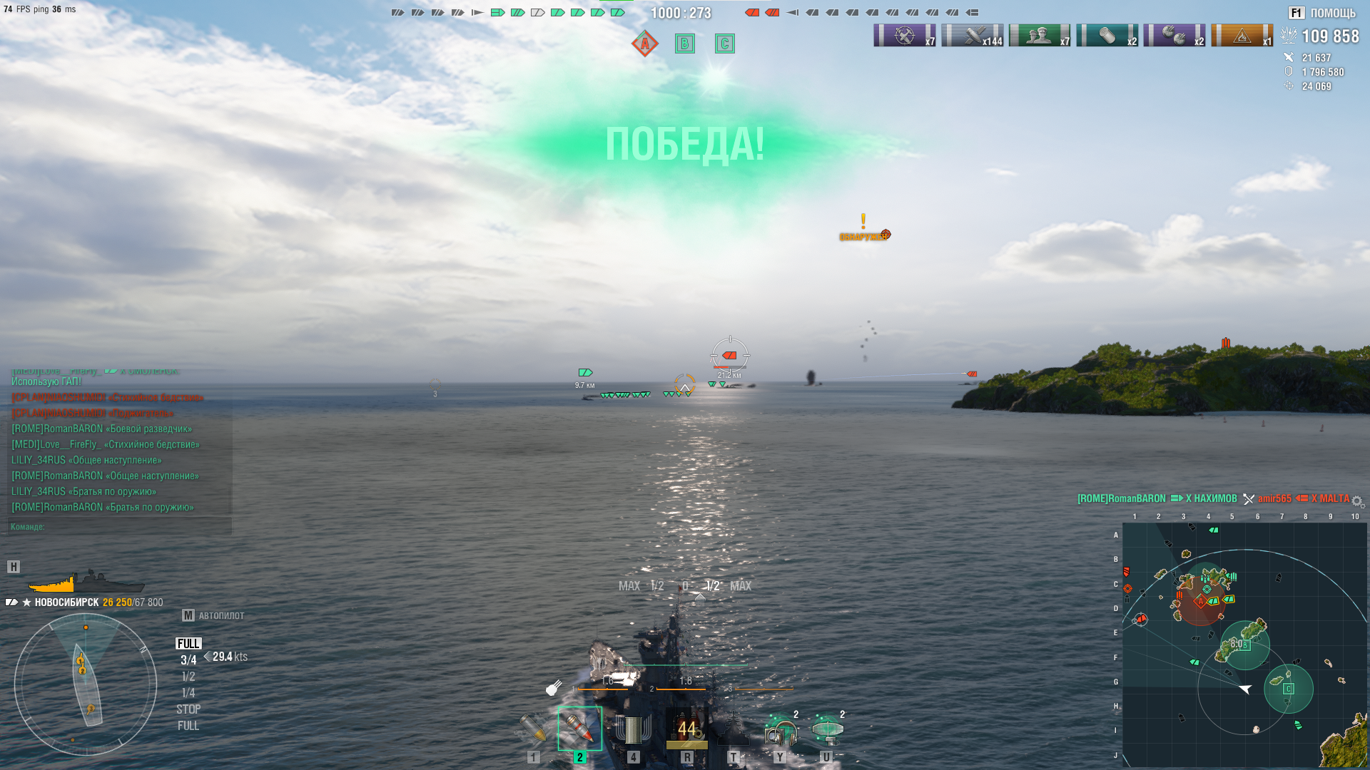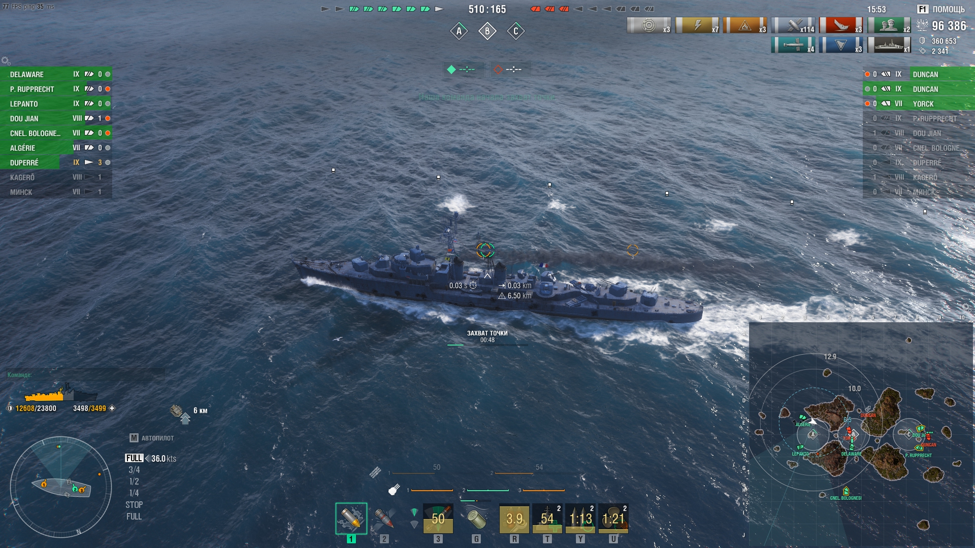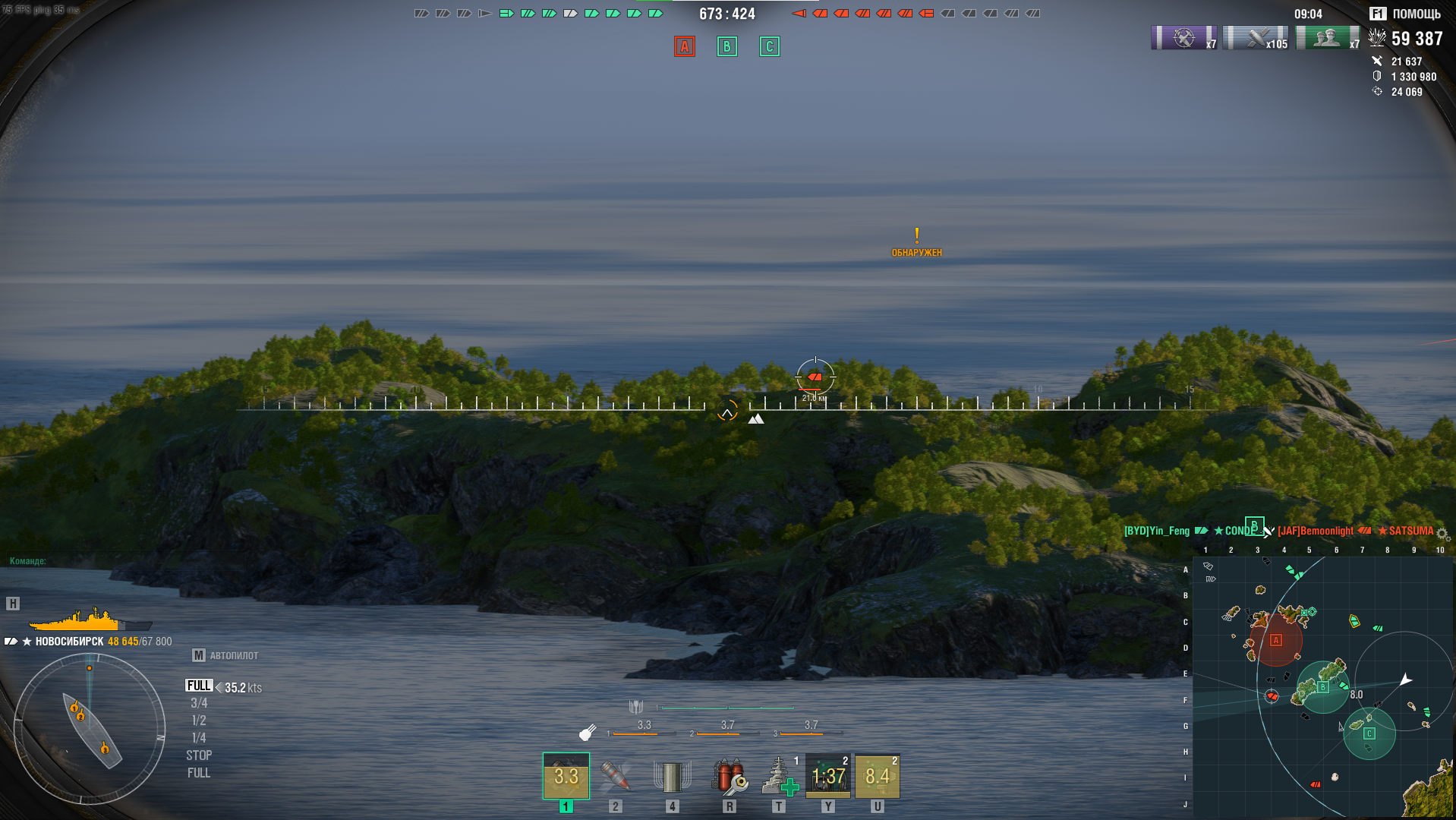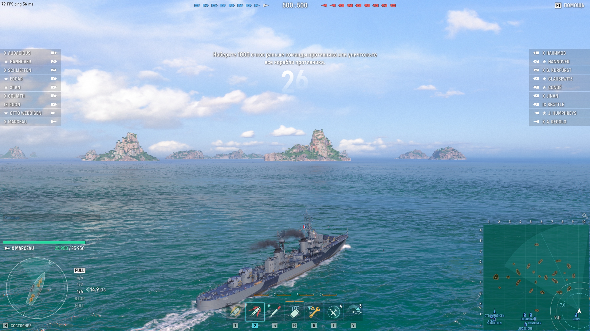 Блин, чёт эсминцы совсем калечные — дальность хода торпед сопоставима с дистанцией засвета, лол. И как тогда кидать из инвиза? У меня только один раз получилось подловить линкор, идущий меж островами.