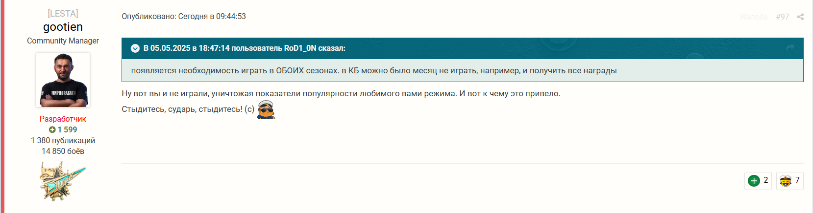 >>49801344 Клановые бои это режим по большей части для энтузиастов. Энтузиастов (неравнодушных и вовлечённых игроков) лестопидор годами выдавливал из игры.