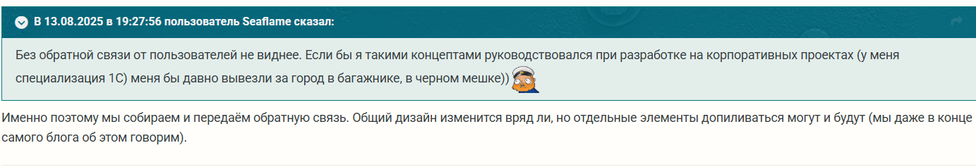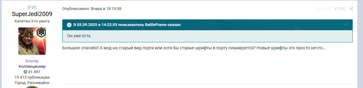 >>50182424 Как же я угарнул, как на замену этому джедаю в моменте резко выскочили два других подсоса на деф. Ведь джедай последние два дня слегонца занят в других не менее важных темах, задавая некоторые крамольные вопросы: >Планируется ли мод на отключение новых циферок урона? >К сожалению, сочетание шрифтов, цветов и новых иконок делает вид корабля в порту не просто хуже, чем было раньше, а как-то прям совсем плохо. Какой-то большой шаг назад. >Надеюсь, я просто чего-то не понимаю, и на самом деле такие изменения пойдут на пользу игре Кажись он сломался, агент от лесты на устранение уже выехал.