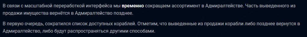 >>50187222 Смотря кто прислал. Если это стандартная рекламка к патчу от члесты, то из интересного будет лишь одна лодка с суперконта (какой-нибудь мусоре), и за 2к голды рандомная десятка из списка самых говняных десяток в истории человечества, и если ты олд-вытиран с 2015 года то вторую говнодесятку бонусом кинут. Через недельку будет ещё трёхуровневый казиныч для лудиков. Адмиралтейство сейчас почти пустое, у них начались очередные перетурбации, покупать нехуй совсем. Вот и вся "халява", на новый год больше веселья.