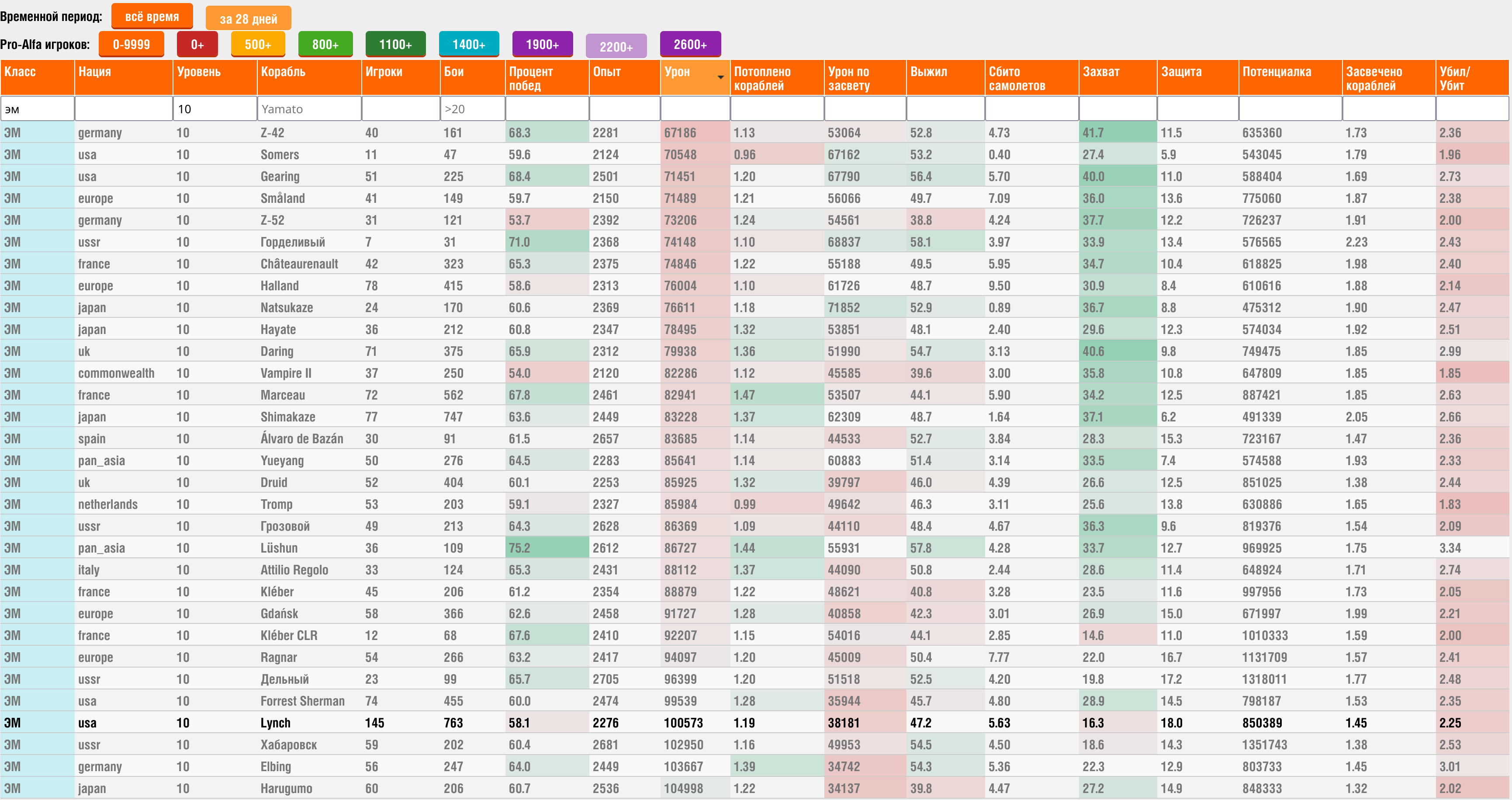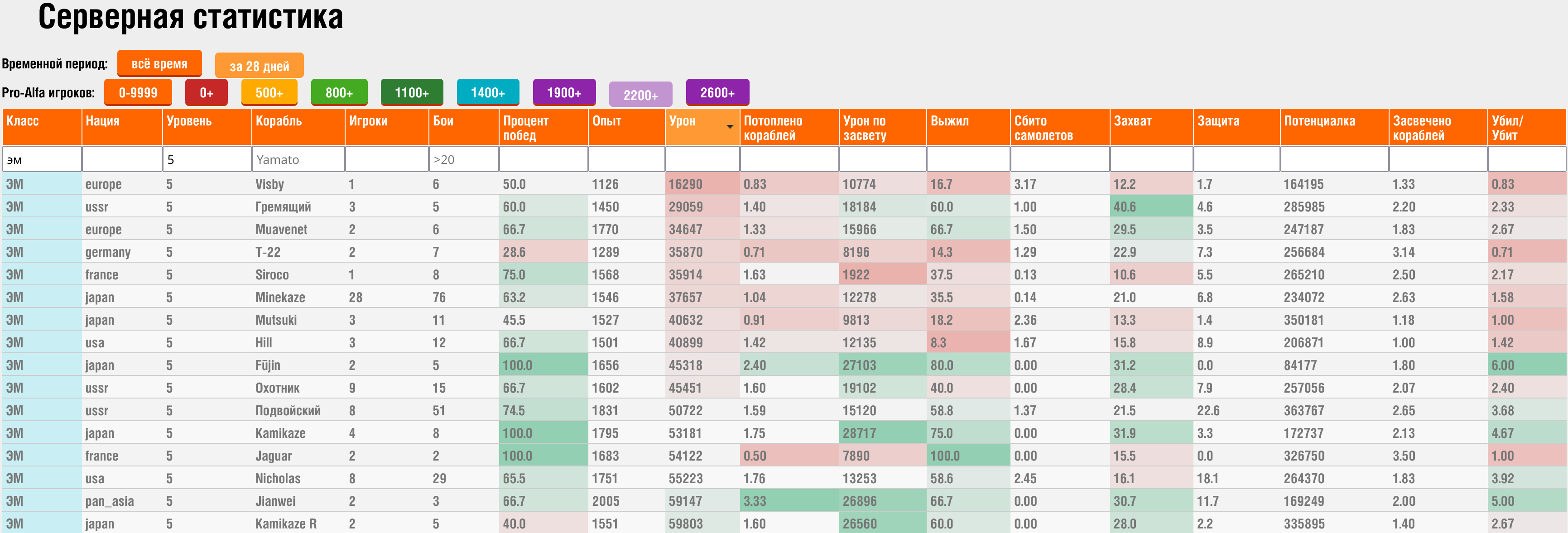 >>50181509 Камикадзе без R. Смысла смотреть нынешнюю статистику нет, на 5 уровнях буквально никто не играет, когда я пытался поиграть на 5 уровне, то в прайм-тайм ждал боя несколько минут и в итоге меня закинуло в катку 4на4. Лестаботов в катке не было, дамажки с 4 кораблей - тоже. Пока на новом акке прокачивал ЭМ6, то ни разу к лестаботам не попал, хотя шизобои 5на5 на были регулярно.