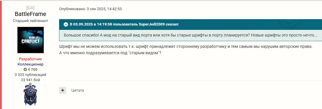 >>50190086 >см. пик. Я думаю, здесь речь о том, что они разрабы. А если игроки выложат - проблем не будет, потому что распространение свободное у того шрифта. Во всяком случае, нечто похожее было с модом на флаг восходящего солнца.