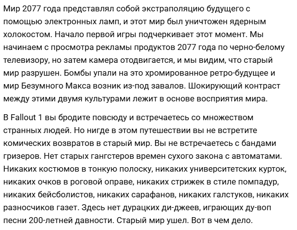 >>50036999 >Я тут подумал и понял, что в оригинальных играх ретрофутуризма почти не было. Всё правильно, но вывод неверный. В том-то и прикол, что в классических Фоллачах не было ретрофутуризма, просто был своеобразный стиль немножко. А потом пришёл Тодд со своей вонючей трёшкой и сказал "ДА ЭТО ЖЕ СТИЛЬ РЕТРОФУТУРИЗМ ВЫ ЧЁ НЕ ПОНЯЛИ ЭТО СТИЛЬ ТАКОЙ, НУ МЫ ЭТОТ СТИЛЬ ПРОДОЛЖИМ" и насрал им везде, где смог. Это людям и не понравилось, что ретрофутуризм был высран из ниоткуда, с тем же успехом в игру можно было орков добавить и назвать их супермутантами, хотя погодите, в трёшке так и сделали.