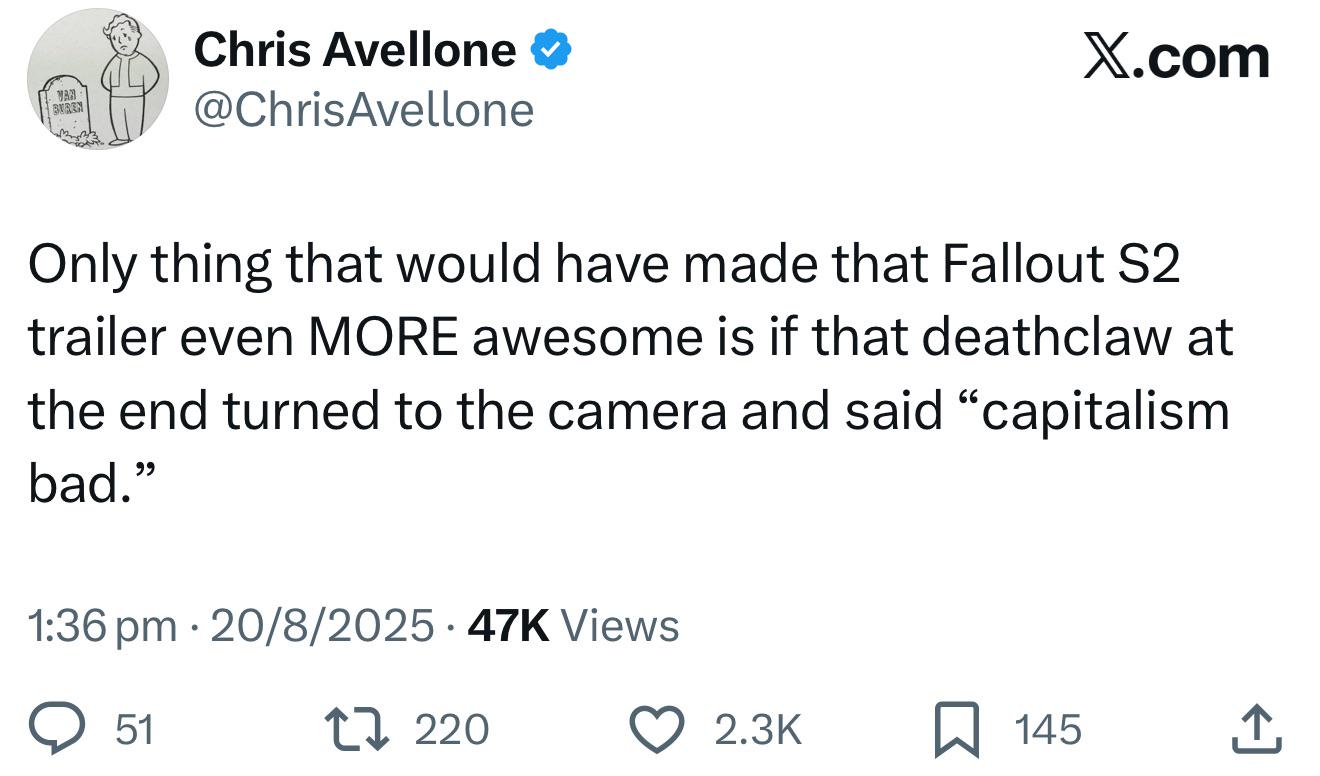 Вчера впервые попробовал 76 - блин, а прикольно сделали. Прям квинтэссенция беседко игр, максимально заточенная на исследование - повсюду локации, домики, записочки и кассеты (даже перебор немного с ними). Походу все разрабы над фол76 работали, а на старфилд просто забили, кое как рандомно сгенерировали локации и положили хер. Вот только с тем что вертикалку в настройках не отключить - это огромный косяк, ебало новичка представили когда он заходит в игру и видит лок в 55 фпс на 165гц мониторе? Я то уже играл в фол4 и знал что надо делать, но это же жесть - обычный чел не будет это гуглить, потом лезть в ини файл в документах... Но игра класс, вчера залип до самой ночи.