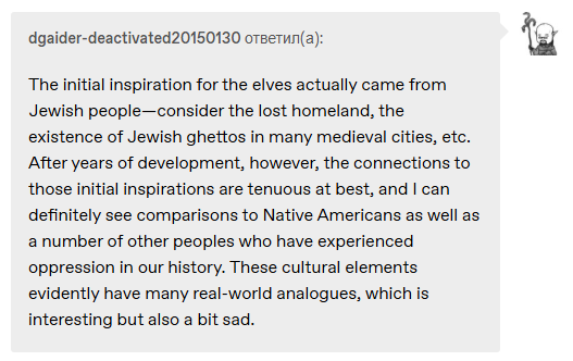 >>50104342 Насчёт эльфов как архетипа во всём фентези это вряд ли, но конкретно у драгон-эйджевских действительно прослеживаются еврейские черты. Вплоть до того, что и там, и там этнос разделён на два разных народа (долийцы и полотёры - сефарды и ашкеназы). Забытый язык, опять же (иврит восстановили только в середине 20 века, как раз к созданию Израиля, а до этого 95% евреев говрили на идише или "лаудино"). Я, впрочем, не думаю, что дур-гей осознанно оставил такую отсылку. Это скорее похоже на проявление какой-то универсалии, что называется.