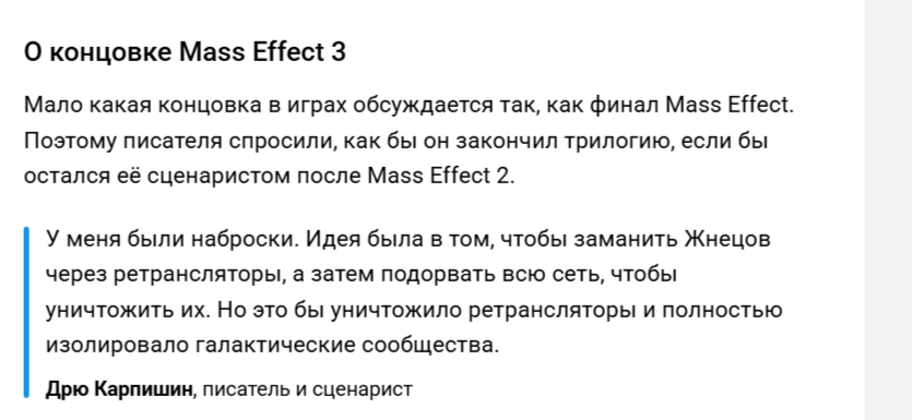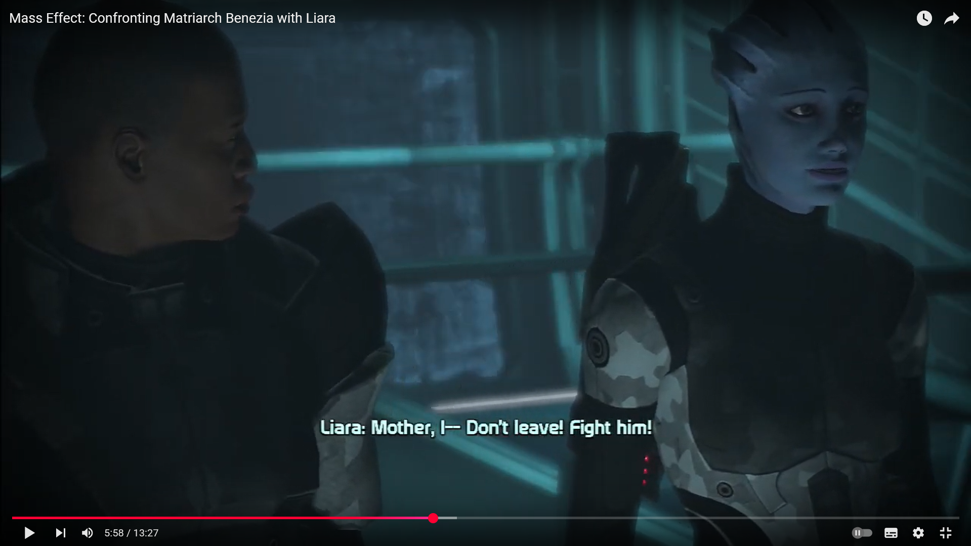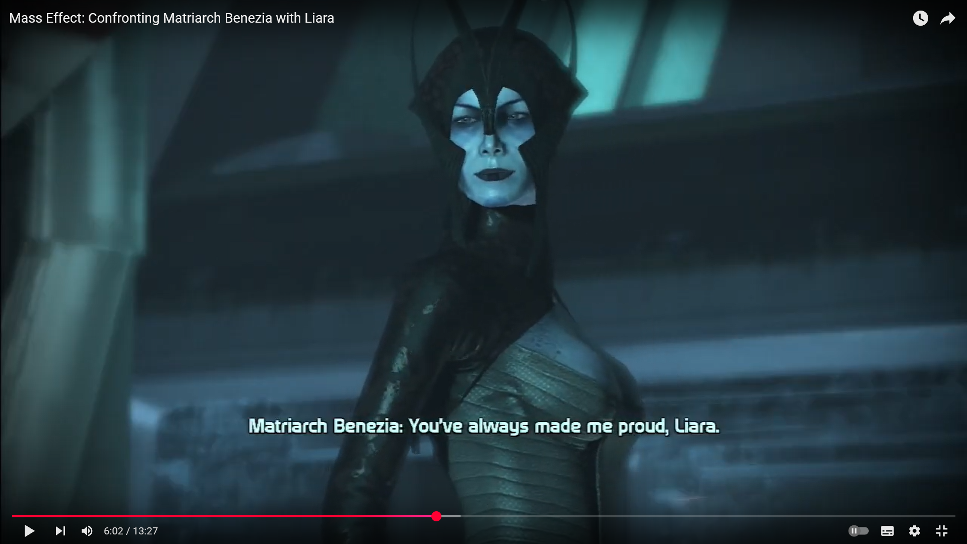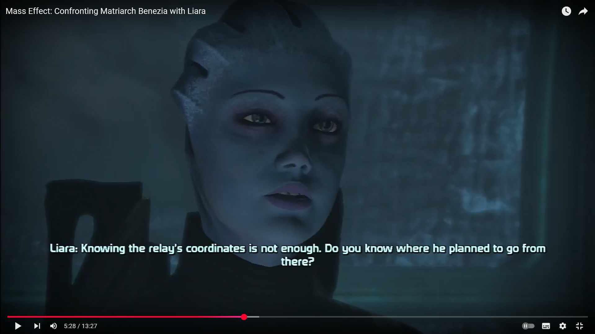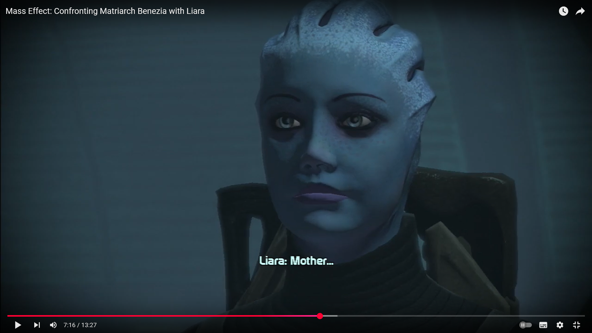 По поводу недавнего Лиарасрача. Я таки дошел до её спасения, хуй знает что там чел с наследием задвигал. Буквально прямая речь Лиары. >С Бенезией не виделась много лет(при этом много по меркам азари) >Последние 50 лет ищет конкретно причины исчезновения протеан >Только вышла из детского возраста, поэтому её никто не воспринимает всерьез >Прямо говорит, что всю свою жизнь посвятила этому вопросу. Хуй знает как тут надо натягивать сову на глобус, чтобы продолжать говорить, что вот эти вот исследования протеан для Лиары мимолетный подростковый бунт, а большую часть жизни она другим занималась с мамкой.