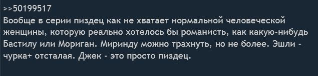 >>50199540 На самом деле и Миранда и Джек вполне себе норм. Миранда изначально воспринимается как поехать на один раз, но в трешке видно, что она прям влюблена в Шепарда (единственная плачет если с ней расстаться, единственная умирает при любых условиях если не продолжить отношения). У Джек в двушке очень всратая внешность, но роман с ней(не тот где мы просто ебем её в багажном отсеке и расходимся, а полноценный) вполне себе годно поставлен, да и в трешке годно сделали сцены.