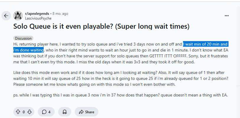 ЕА важно чтобы работяги задерживались часа на 2 или 3 в день, ради той самой катки в которой и лобби не потное и/или напарники норм.