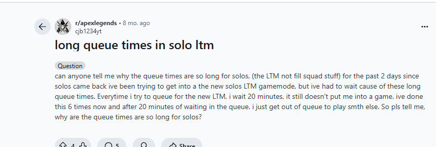>>48903032 Это был самый лучший режим за историю апекс. Но нормисы быстренько наныли что без друзьяшек тяжело. Напомнил о грустном. Это наверное редкий случай когда кайф от игры действительно был выше чем жопаболь, там конечно были подсосы (и пиздатая защита от них кстати) , преды и прочие стримерки, но у меня один хер кд там по ощущениям было раза в 2 выше чем в обычной игре