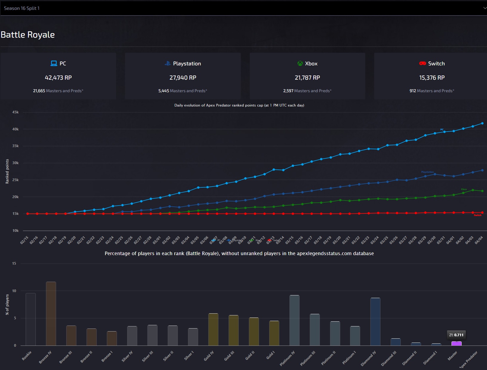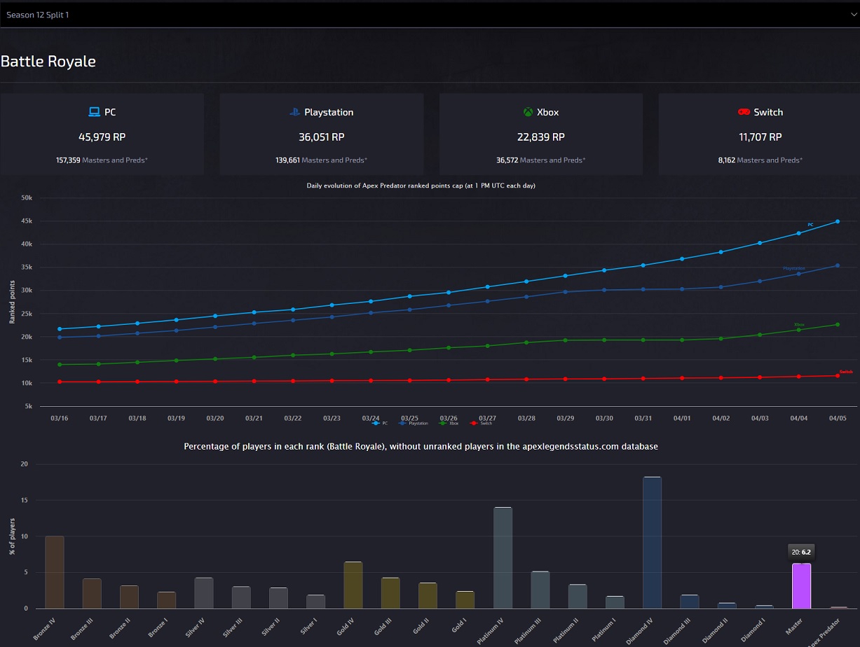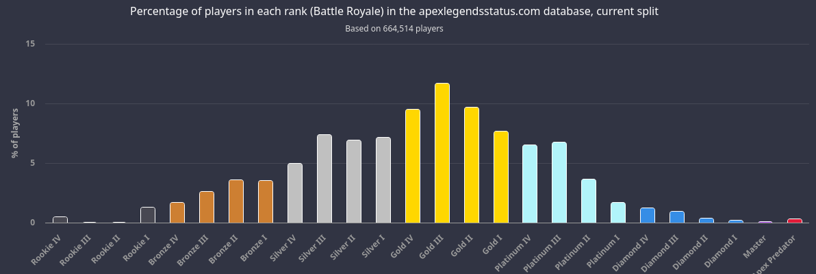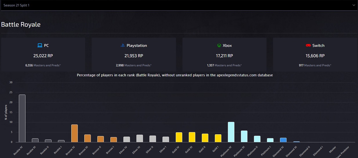 >>50138755 Ебать ты воннаби мамкин манипулятор статистикой, иди в росстат работать. Я тебе написал, что мне не нравится. Игроков с последним дохуя илитным рангом в котором лимитированное количество мест не должно быть больше чем игроков в 3 рангах до него по отдельности, это нонсенс. Даймонд ни в одной сессионой игре, и в самом старом апексе в том числе, не должен быть дохуя илитным рангом с топ3-топ2 персинтилем игроков, это нонсенс. Мне похуй на твой мастер, с хуя ли из даймонда с нихуя сделали ебать не въебенно илитный ранг.