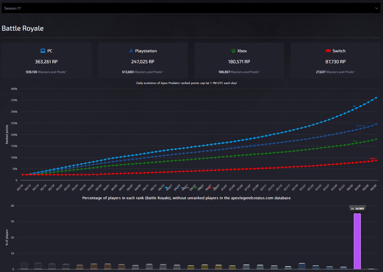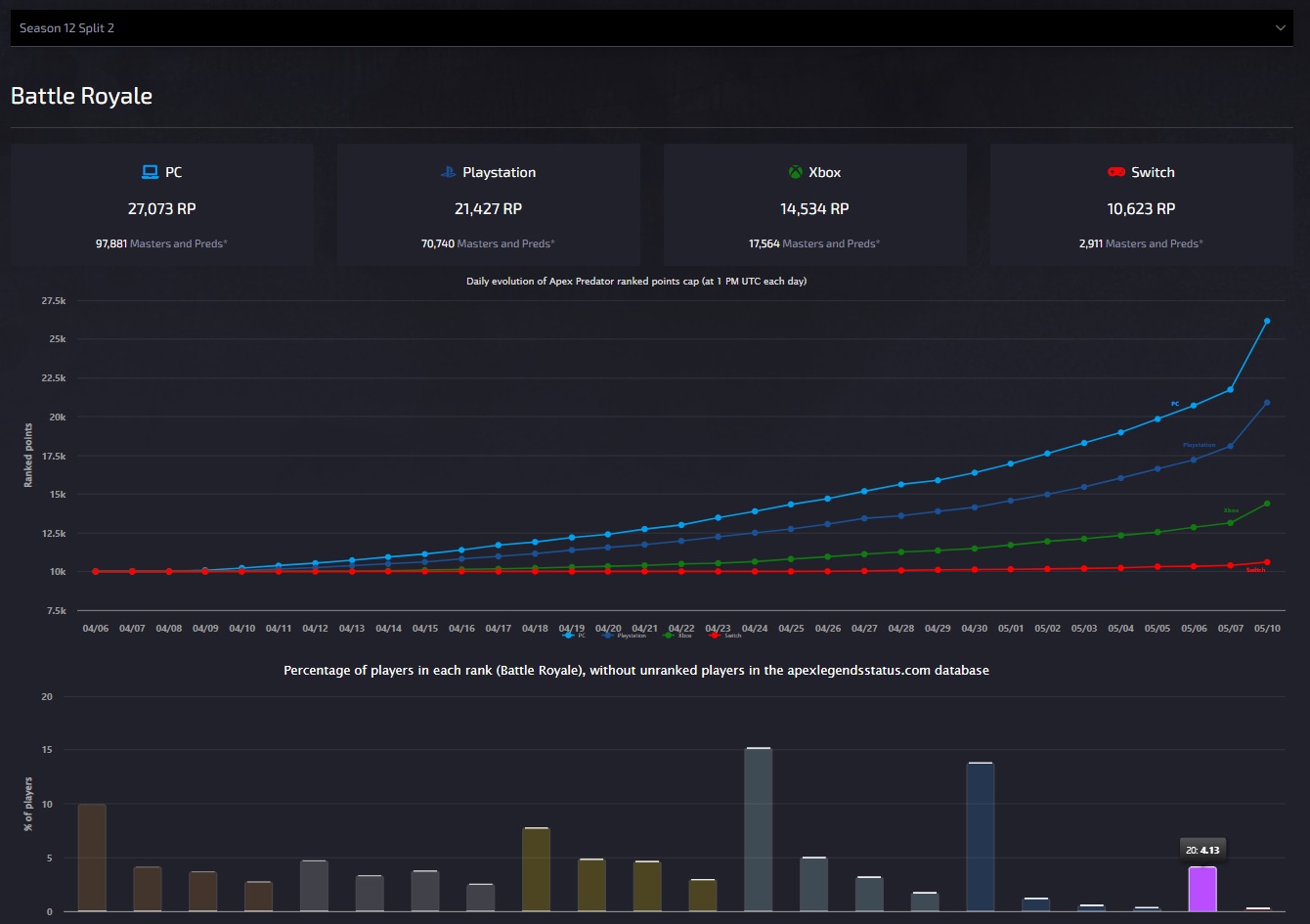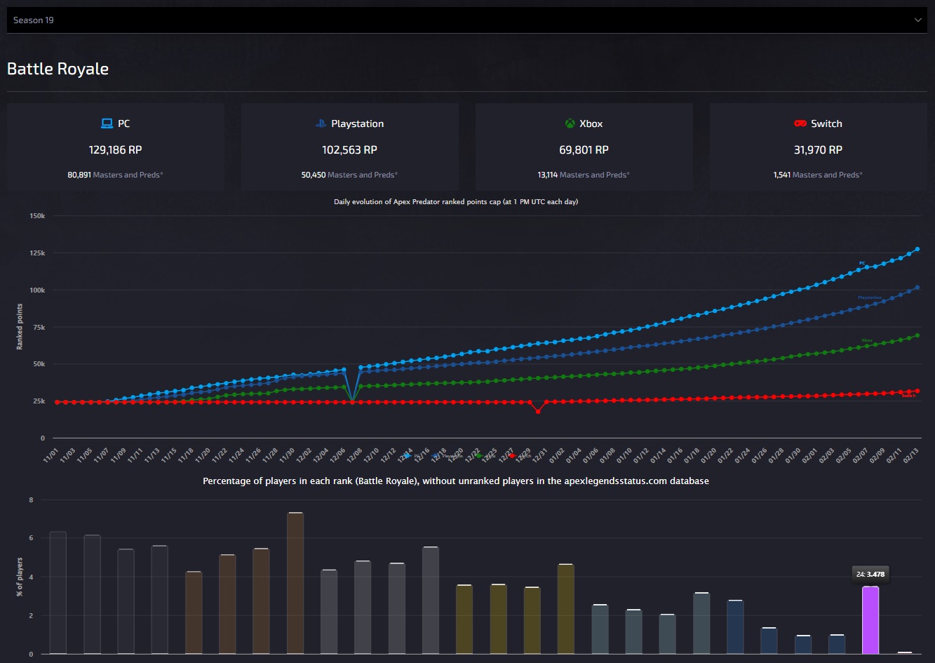>>50138755 Ебать ты воннаби мамкин манипулятор статистикой, иди в росстат работать. Я тебе написал, что мне не нравится. Игроков с последним дохуя илитным рангом в котором лимитированное количество мест не должно быть больше чем игроков в 3 рангах до него по отдельности, это нонсенс. Даймонд ни в одной сессионой игре, и в самом старом апексе в том числе, не должен быть дохуя илитным рангом с топ3-топ2 персинтилем игроков, это нонсенс. Мне похуй на твой мастер, с хуя ли из даймонда с нихуя сделали ебать не въебенно илитный ранг.