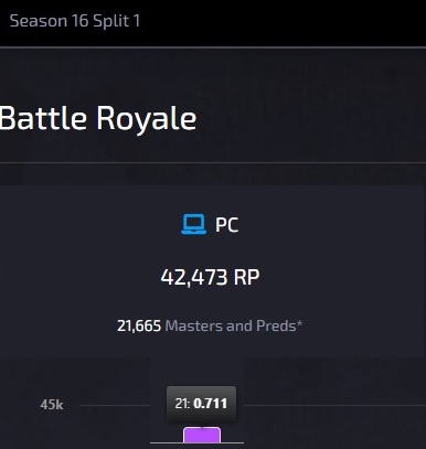 Вообще блять в соло-режиме было очень потно, это единственный режим, где мне закидывало чуваков из алгса нескольких разных, а мастеры и перды и даймонды это словно дефолтное наполнение лобби было, с щепоткой неострейфящих ттв-дауничей на лысых рейфах сверху.