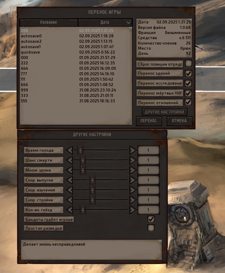 >>50239942 > Зачем же с дефолтным кошмаром играть, если ты дней сто уже прожил, судя по стамине. почти в два раза больше, но лень заморачиваться - так, настроил приоритет лута по коробкам и чуть инвентарь кастомизировал