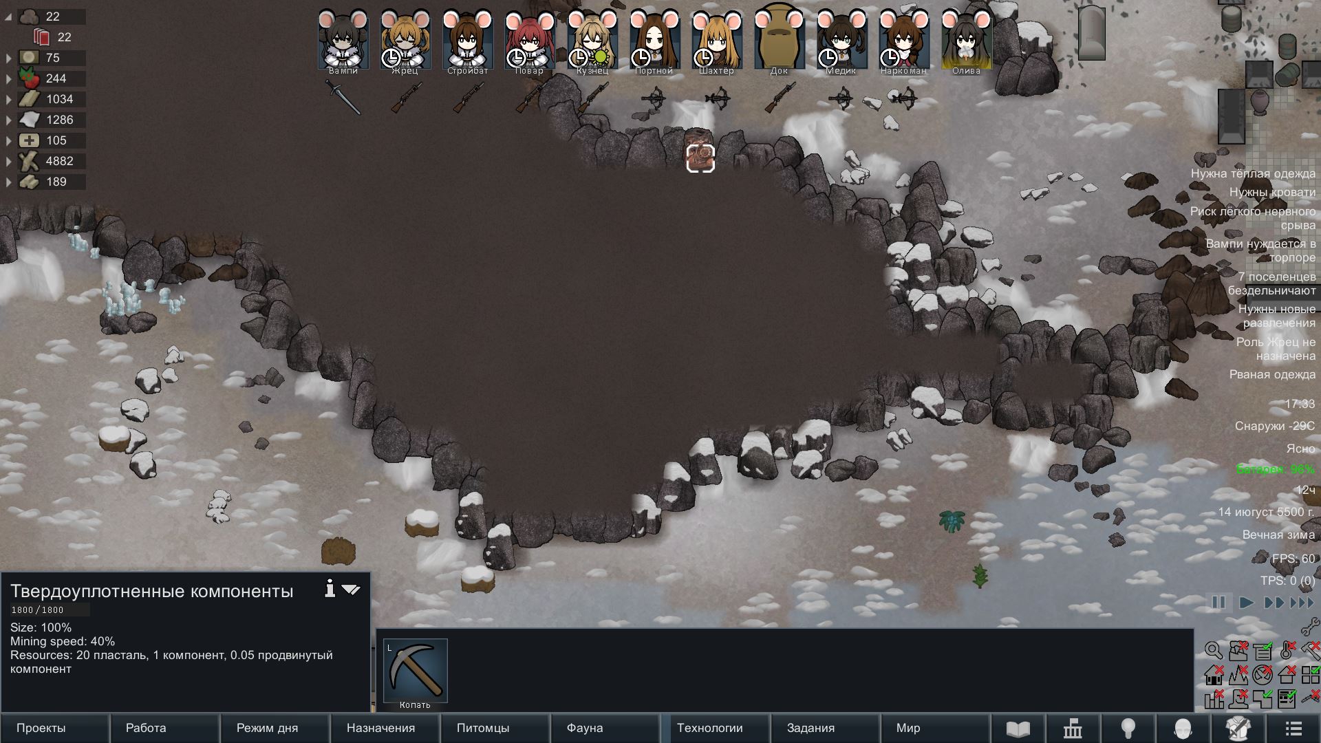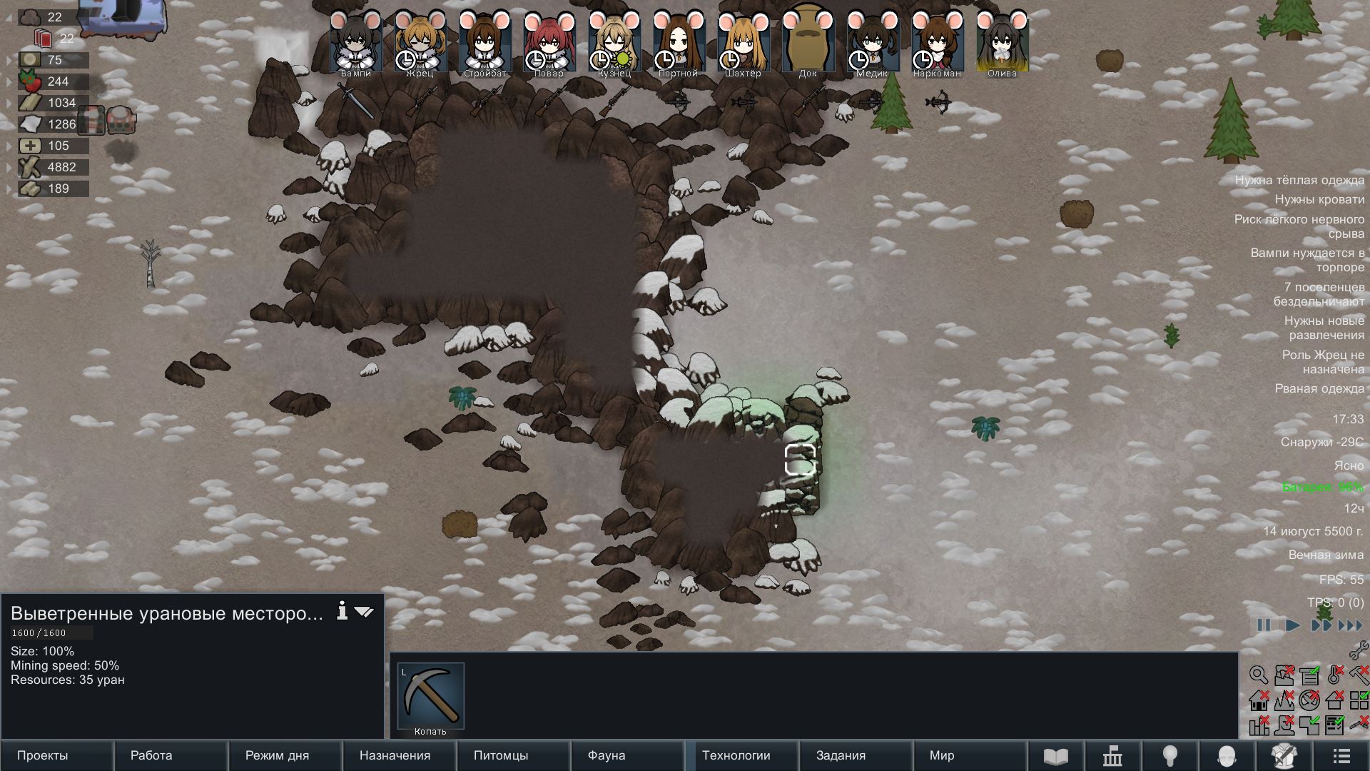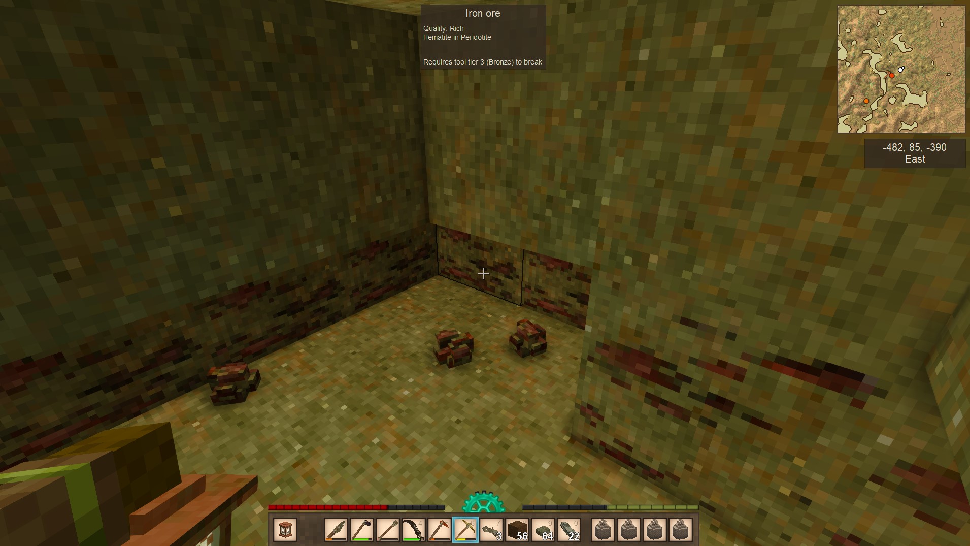 И если медь не проблема, то с бронзой всё куда сложнее. За всё время нашёл немного олова, слитков 6 бронзы вышло, немного цинка и висмута(висмута знаю где накопать, но с цинком вообще голяк, так что висмут мне без надобности), получится ещё слитков 5. Случайно наткнулся в кварце на серебро, много серебра. А пока гулял, так же в кварце случайно наткнулся на золото. Хватало на 10 слитков, или можно было сразу сделать наковальню. Я посчитал, что топовую бронзу как-то жалко для наковальни и пустил на инструменты. Это было ошибкой, ведь гуляя я случайно ёбнулся в штольню и нашёл просто кучу железа, я столько руды ещё никогда не видел, копал её там 2 дня, даже темпоральную шестерёнку заюзал, чтобы кукухой не поехать. Только вот теперь это железо не на чем выковать из крицы, нужна бронзовая наковальня. Пойду на место, где нашёл золото, мне его совсем немного надо, буквально на 4 слитка чёрной бронзы, сделаю наковальню.