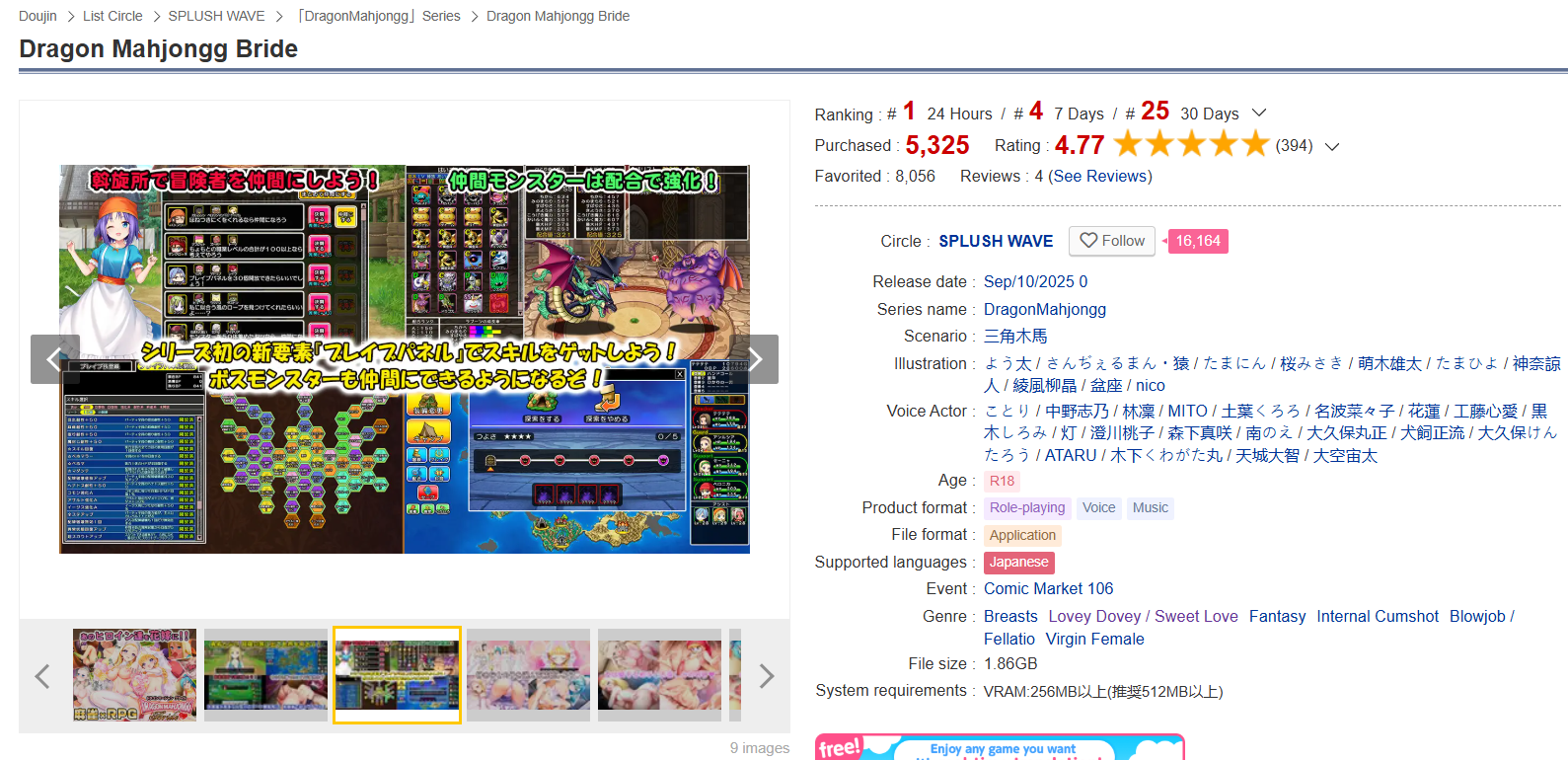 А вот с того что осилів сегодня ночью, это вот что примечательное Начну с пик2. Dragon Mahjongg Bride Только для тех, у кого нет проблем с самым базовым я посиком (чтобы понять куда тыкать) и для любителей маджонга. Это очередная игра с длинной серии с чарами с драгон квеста. Уверен что для тех кто понимает диалоги и лор драгонквестов она будет очень душевной, но мне как залетухе серии (Там подобных игр уже с десяток вышло) игра показалась, переусложненной. Кроме самого маджонга (уже відсіяли большинство потреблядей) есть куча дрочерства статов для прохождения. Но эти все проблемы как для порноигры нивелируются ОЧЕНЬ сочной картинкой. Можете сделать как я і скачать готовий сейв с https://doujin-savedata.blog.jp/ что сэкономит вам десяток часов ради очень сочных сценок. Если же вы ЕЛІТА , которая не брезгует особыми технологиями перевода, можете насладится очередным вином. Отзывы на ДЛКе намекают.