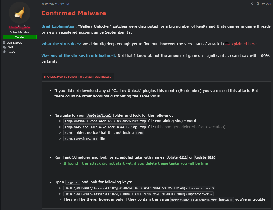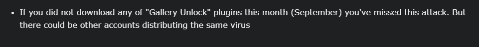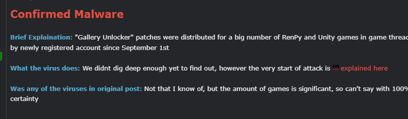 >>50241904 Когда разраб релизит апдейт - кто-то в попыхах запихнул вирус внутрь кода, заранее подготовленный, что сработает только через пол месяца чтоб побольше заразилось, после чего вбросил ссылку на свою "Новую" версию в тред Фки. Тот кто мониторил, в силу лени, просто вставил эту версию в шапочку, а те кто тоже хотели скинуть новую версию увидели что ее уже скинули и перехотели. Перед скачиванием проверяйте тред, в идеале кто скинул ссылку на новый апдейт, если аккаунт до этого не постил в треде но имеет ссылку, и если акаунту меньше полугода - кладите хуй тут же