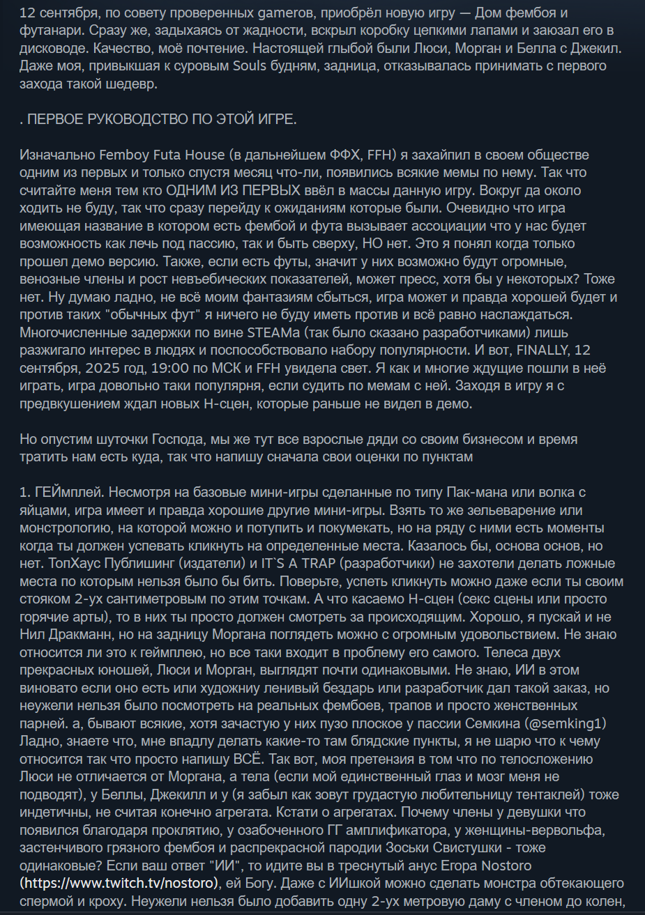 Я стим листал, увидел что эта фигня в популярных, зашел почитать отзывы (большая часть из них на русском из забавного), наткнулся на школьника с жаждой венозных членов и поделился в тредике. Игра хуйня как минимум по той причине что нагло пиздит, и в ней нет фут (Ни у одной футы нет пизды)