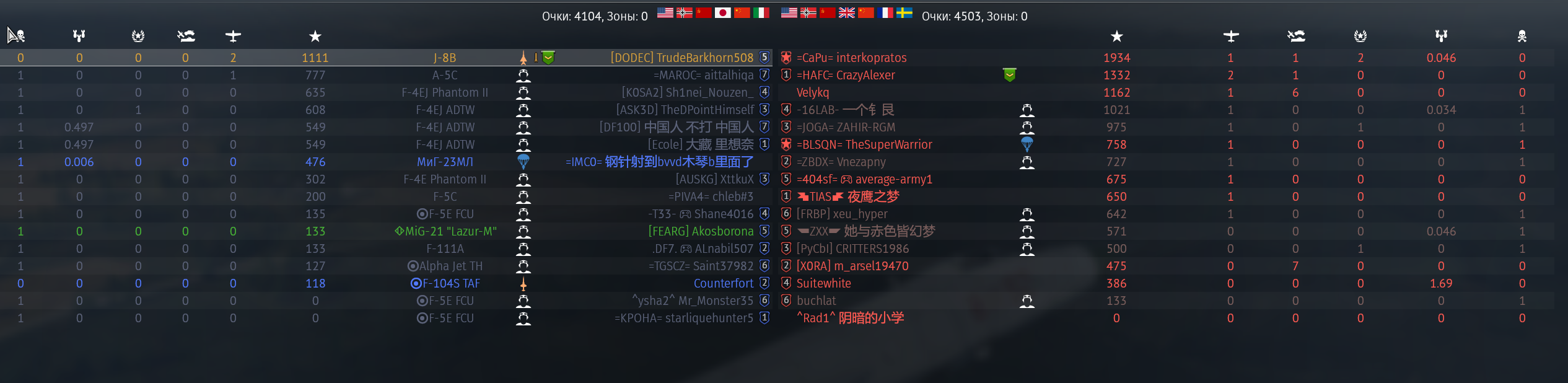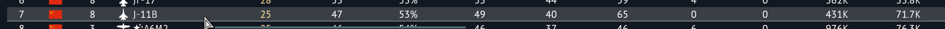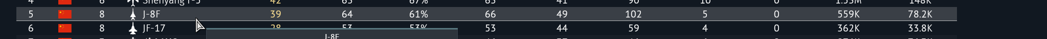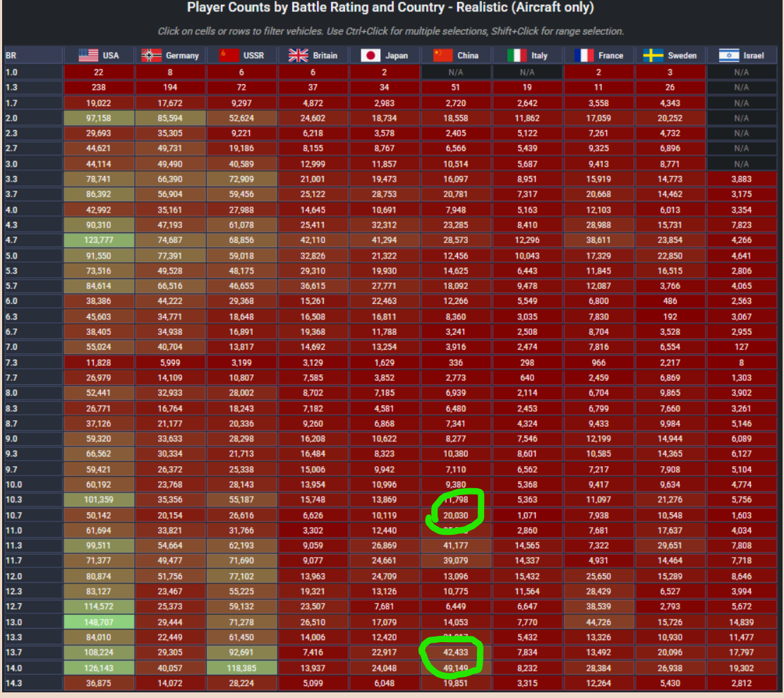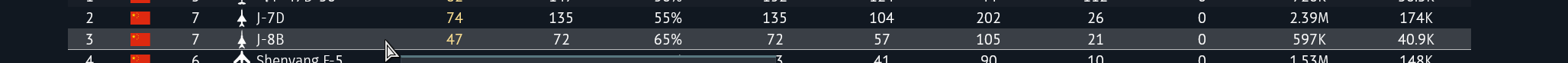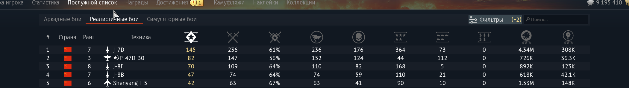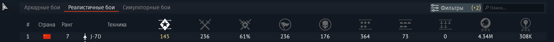 Сортировка по КД 13.7 самолетов. У китайцев такие же показатели как у Ф-15J(M) но в 5 раз(!!!) больше боев. И да учитывая что JM лучше 15С и на том же бре... И эти показатели лучше любого натолитака кроме французов. Но у тех - мики.